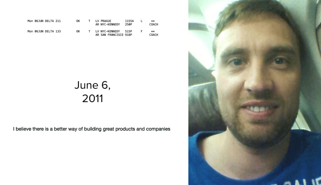 While he was brainstorming, he came up with an idea that would eventually become Productboard. He commemorated this eureka moment by writing down the words "I believe there is a better way of building great products and companies”, and he even took a selfie of himself on the flight to commemorate the idea for posterity, which was later posted on Productboard’s blog.