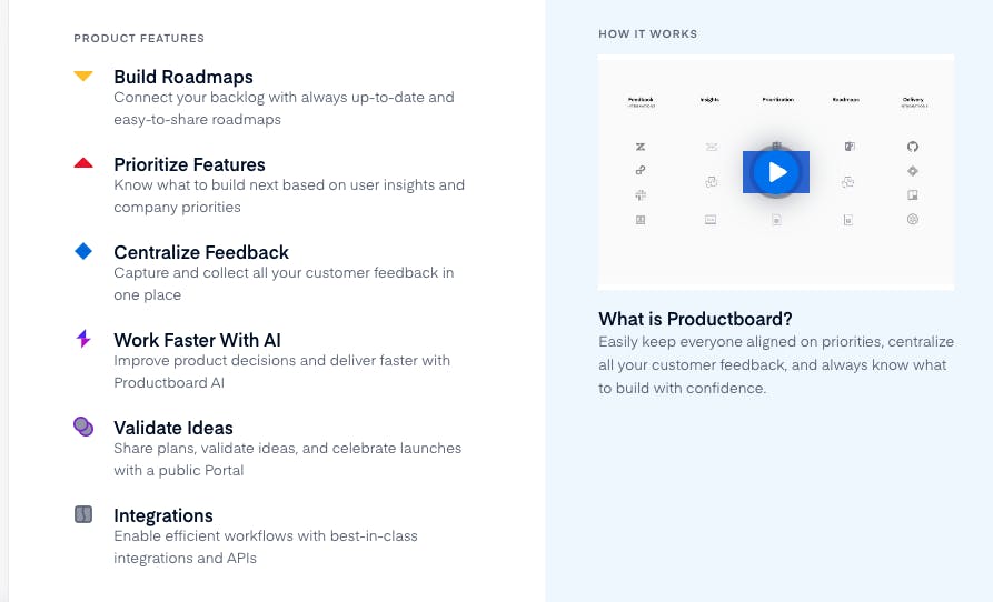 Productboard was created to help address this point. Productboard is a software platform that helps product managers gather customer feedback, prioritize features, and build roadmaps to create products. It brings insights, decisions, and execution together in one place, which is intended to streamline collaboration, create alignment across functions, and allow product teams to gain better visibility. It is designed to act as a central hub for everything related to product.