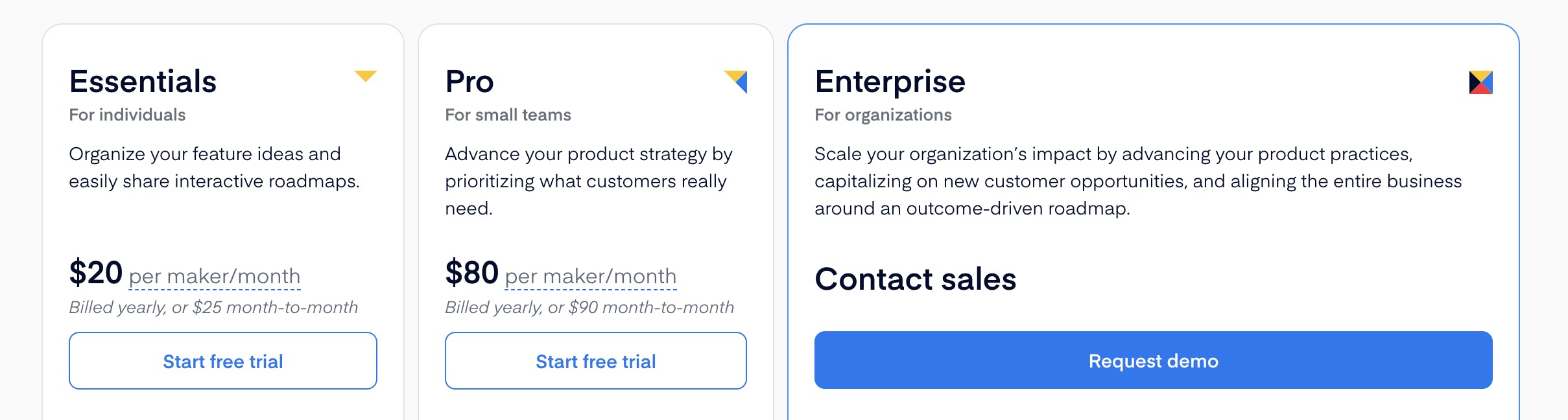 Productboard only charges users for the number of “maker” seats and allows customers unlimited numbers of free contributors and viewers. Pricing is tiered according to Essentials, Pro, and Enterprise plans. The Essentials tier costs $20 per maker/month billed yearly. The Pro tier costs $80 per maker/month billed yearly. Enterprise pricing is custom and not publicly disclosed. Feature sets across the different tiers differ, with the company detailing them in its pricing plan comparison document.