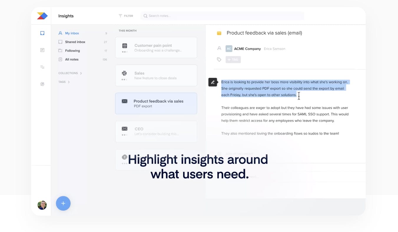 Productboard’s customer feedback solution allows users to quickly collect customer feedback through notes. Augmented with machine learning, this tool is able to track trending features, tags, and segments parsed from qualitative notes over time, with clarity of customer attribution for each piece of feedback. In May 2022, Productboard acquired Satismeter, a feedback platform for product teams, to help power its customer feedback functionality.