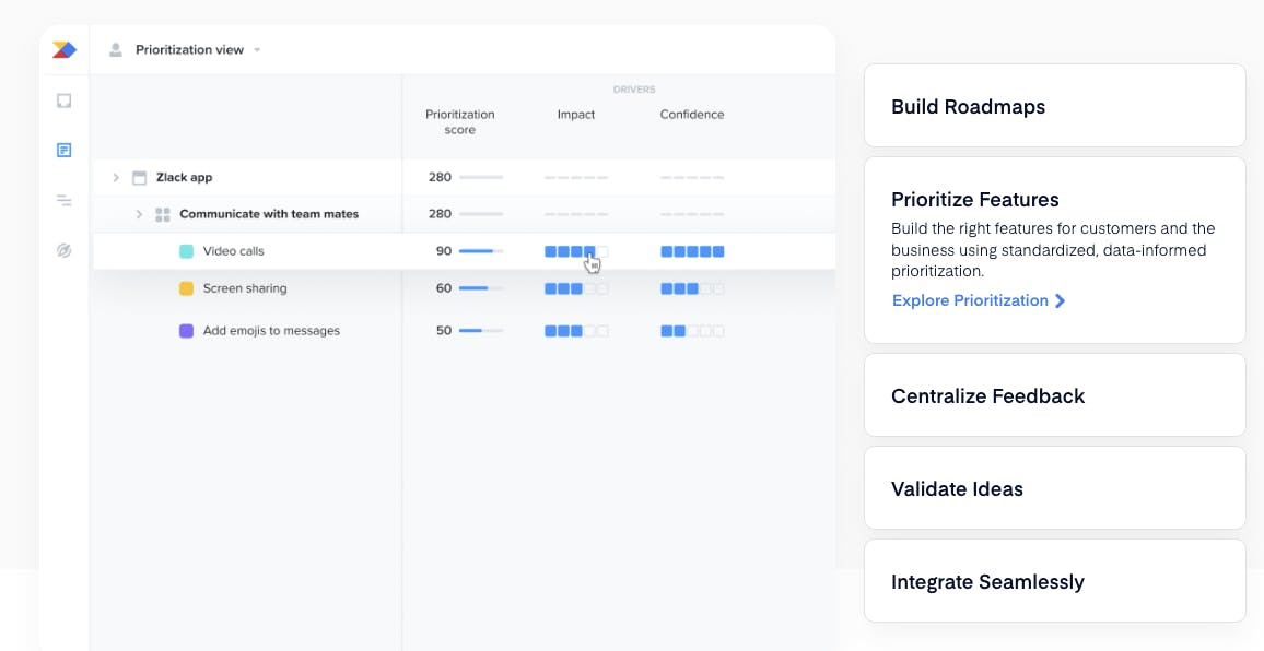 Productboard’s Prioritization tool allows users to see consolidated customer feedback and triage features for development with a standardized framework driven by a customized metrics framework. Its value proposition is to reduce the burden of consolidating multiple sources of truth when it comes to customer and internal feedback, giving stakeholders the ability to create and manage a centralized dashboard consolidating drivers, objectives, potential impact, and level of effort. Productboard also allows for prioritization with nuanced segmentation.