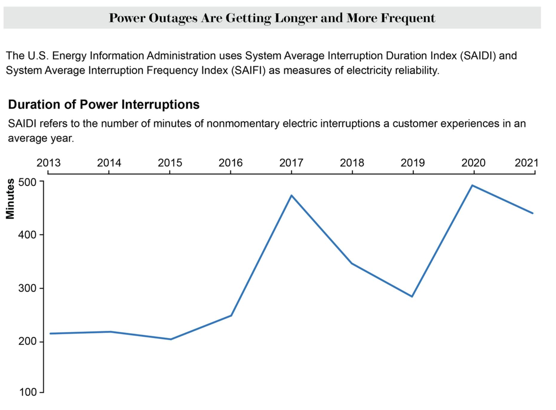 Grid outages are becoming increasingly frequent, and blackouts are longer lasting. Between 2013 and 2021 the number of minutes of grid outage per customer in the US increased from about 210 minutes to over 400 minutes on average.