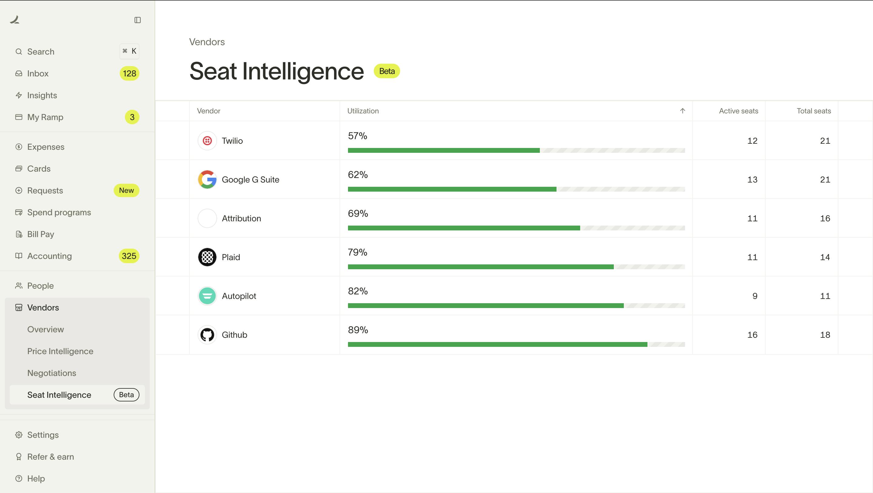 In January 2024, Ramp released Seat Intelligence which remained in beta as of May 2024. Seat Intelligence tracks software usage against the number of seats businesses are getting billed for through its Okta integration to ensure that businesses are getting the desired value from SaaS contracts.
