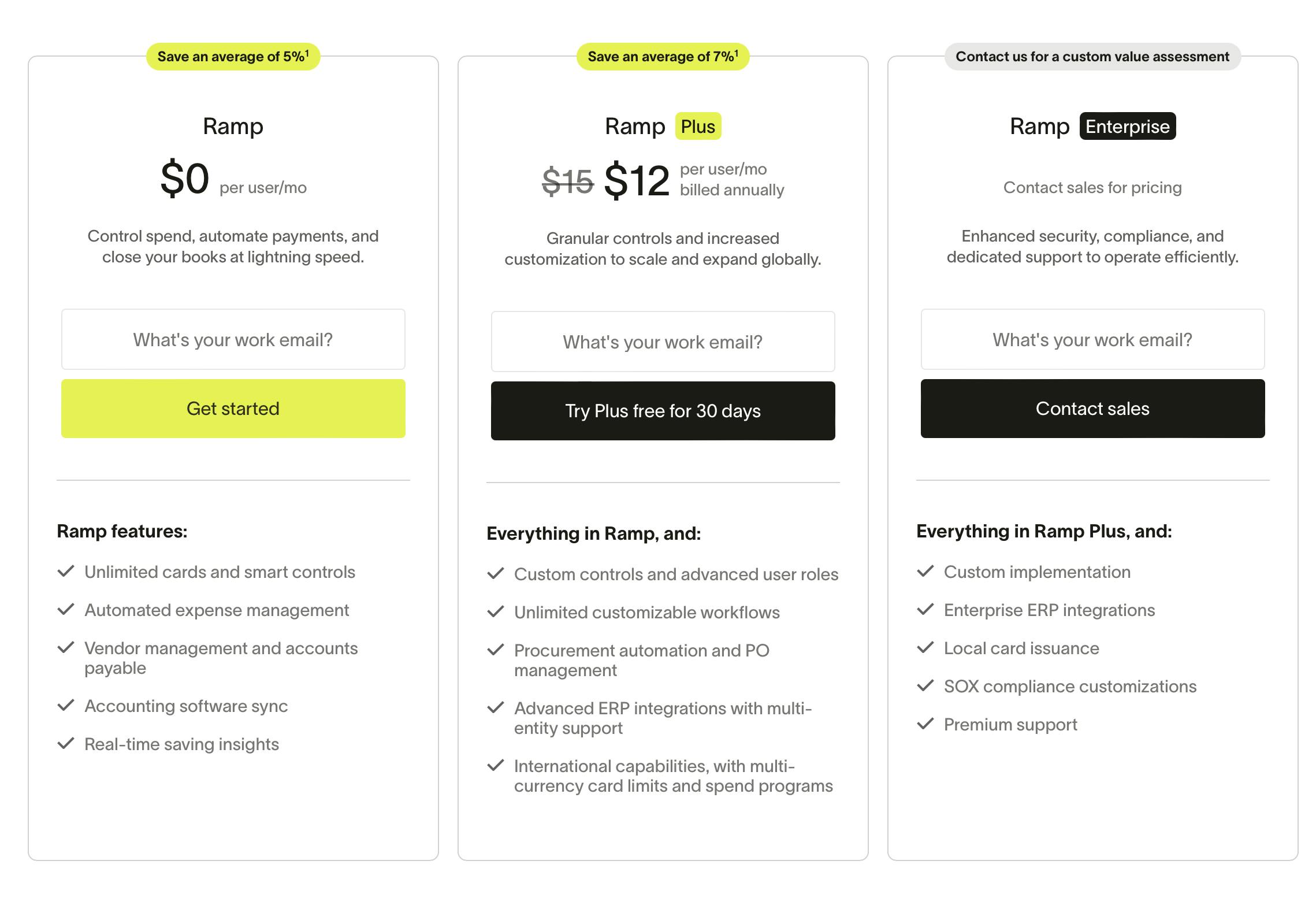 Ramp (no cost): This plan offers unlimited cards and smart controls, access to automated expense management, vendor management and accounts payable, accounting software sync, and real-time saving insights.