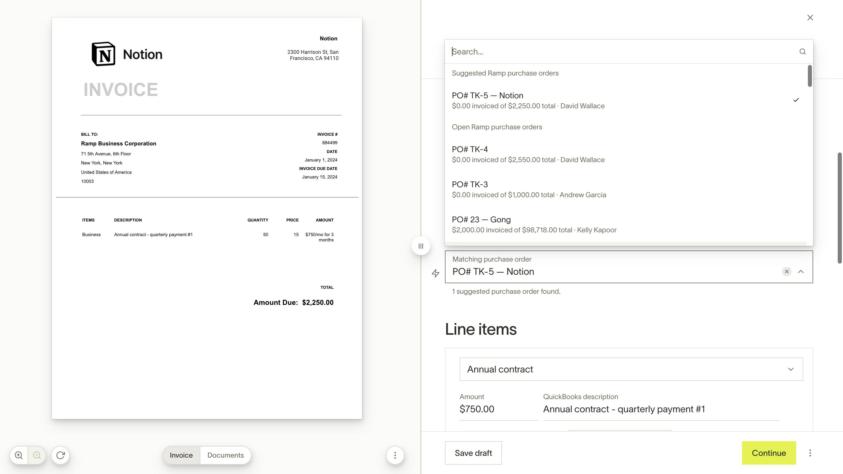 Ramp also allows customers to match invoices between Ramp Bill Pay to POs created in Ramp. If there’s an exact match for the Ramp, it will be automatically matched, otherwise options will be suggested. This matching then cascades down to invoice line items with PO line items.