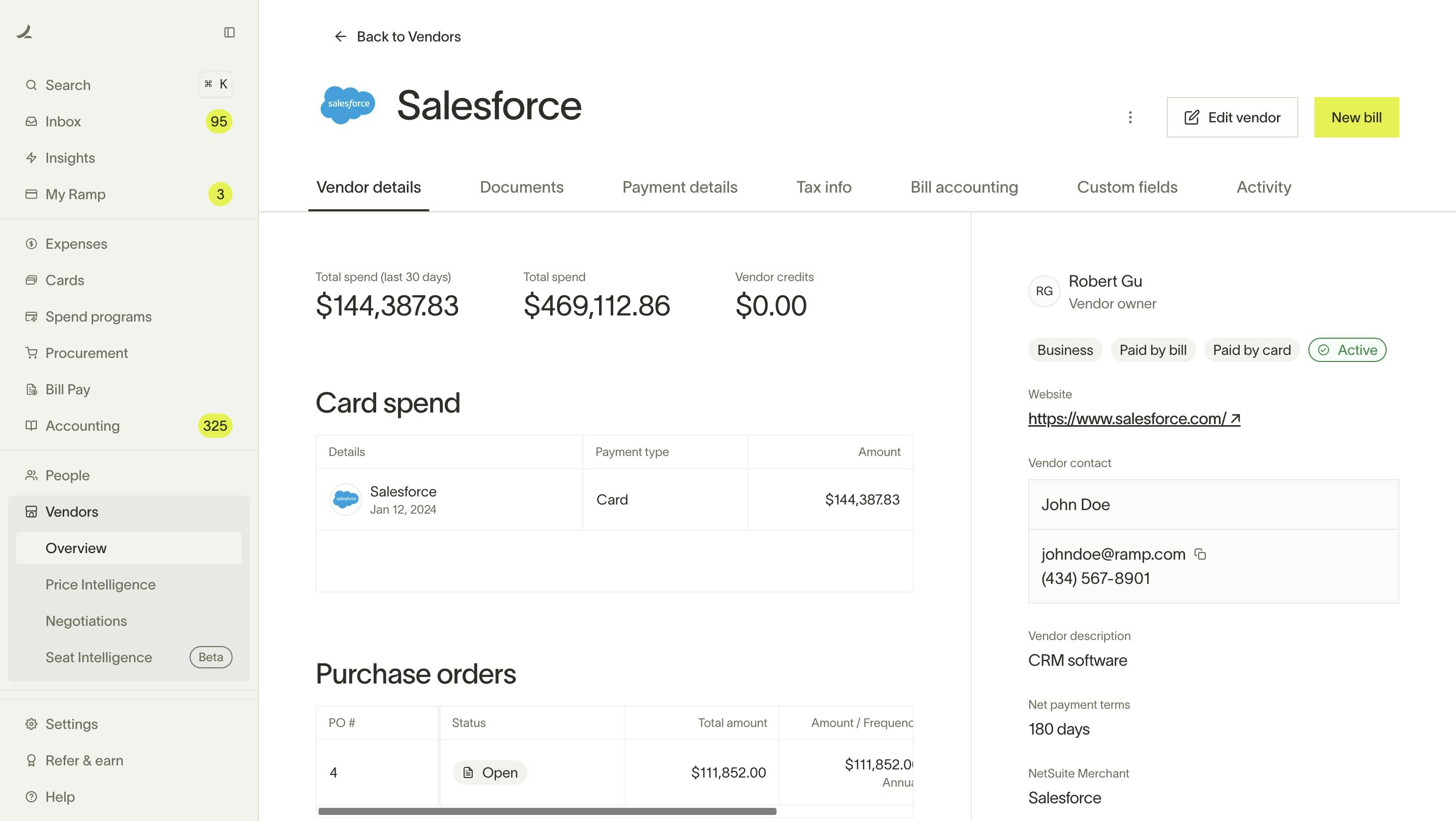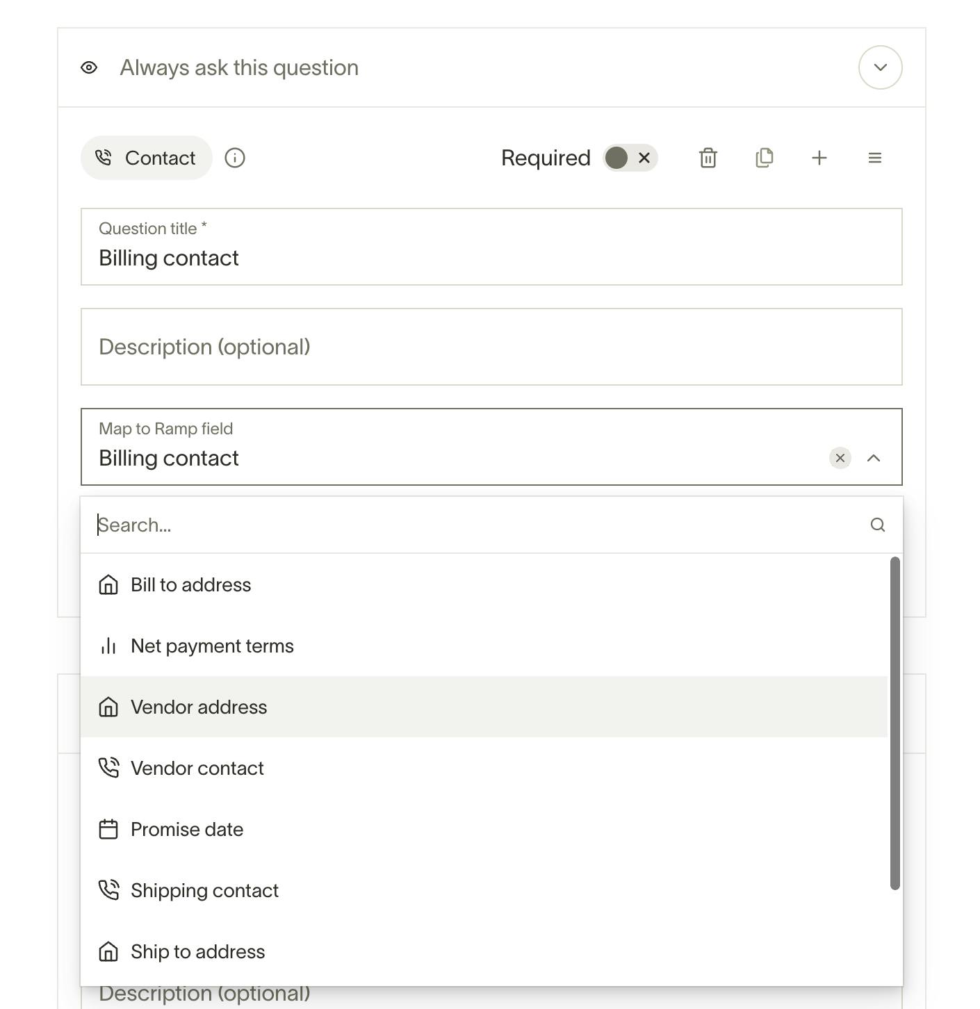 Ramp also allows customers to upload key documents associated with the vendor like contracts, form W-9s and other tax information, payment instructions, and more. For Ramp Plus customers, admins or bookkeepers can add custom fields, to build a source of truth for vendors on Ramp.