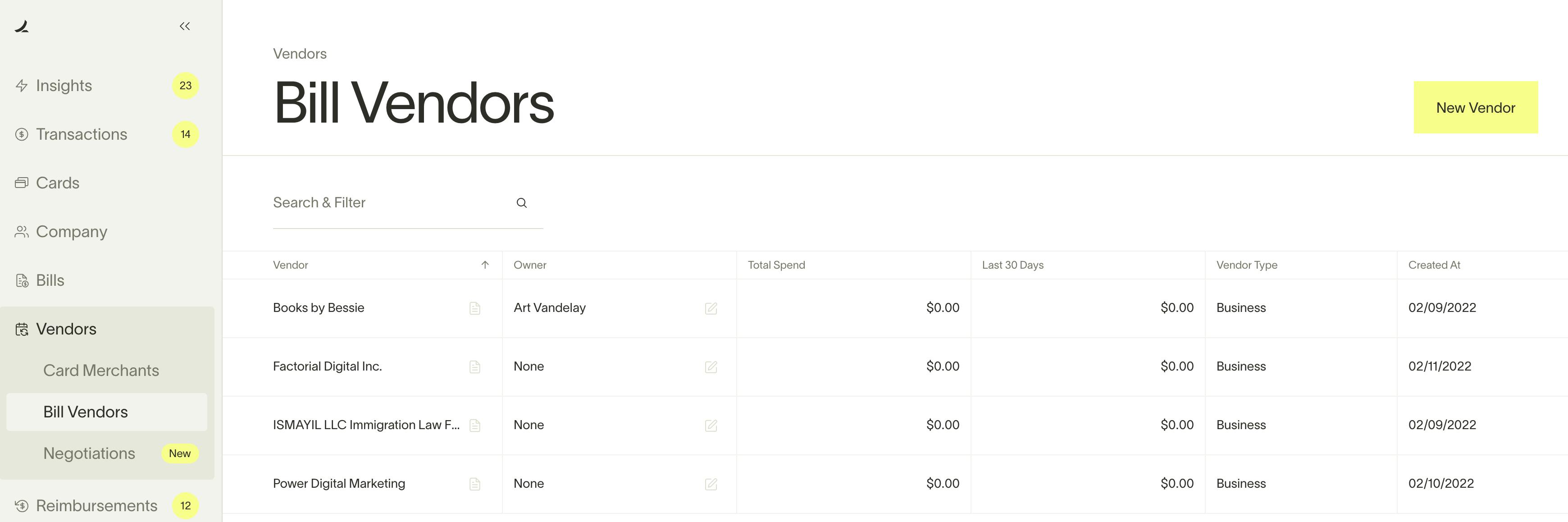 When a transaction to a vendor occurs, it is added to the vendor management tab which provides an overview of spend. Clicking on a specific vendor will provide more details like recent bills or card transactions.