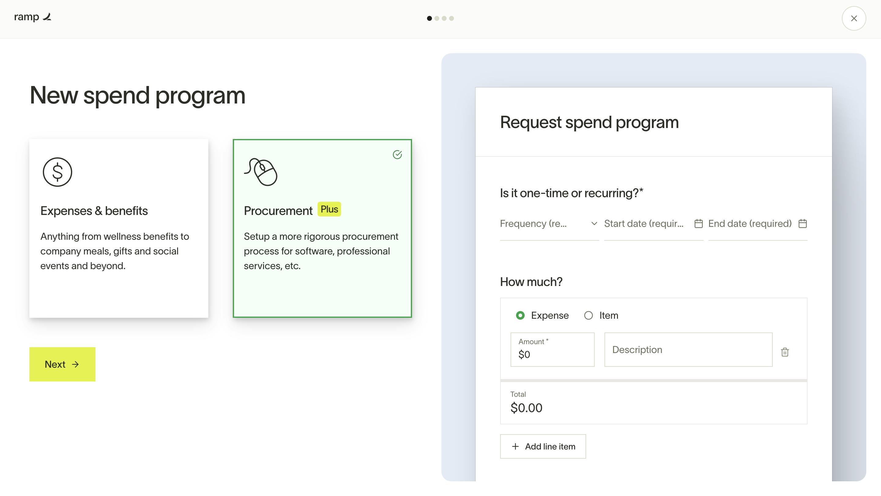 In August 2023, Ramp announced the launch of Ramp Plus, which is intended to help "growing companies with their most complex financial operations" with an "all-in-one functionality" with several offerings.