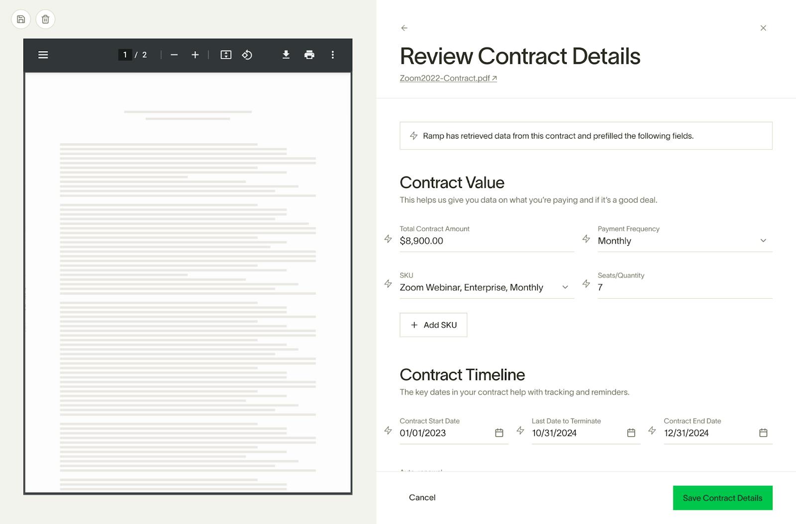 If the selected file is a contract, Ramp has the ability to parse the contract and extract key details like contract amount, payment frequency, and contract start or end dates. Users also have the ability to set reminders to the vendor owner 30 or 60 days prior to the last day to terminate or the contract end date (whichever may come first). This is being released in a phased approach as of May 2024.