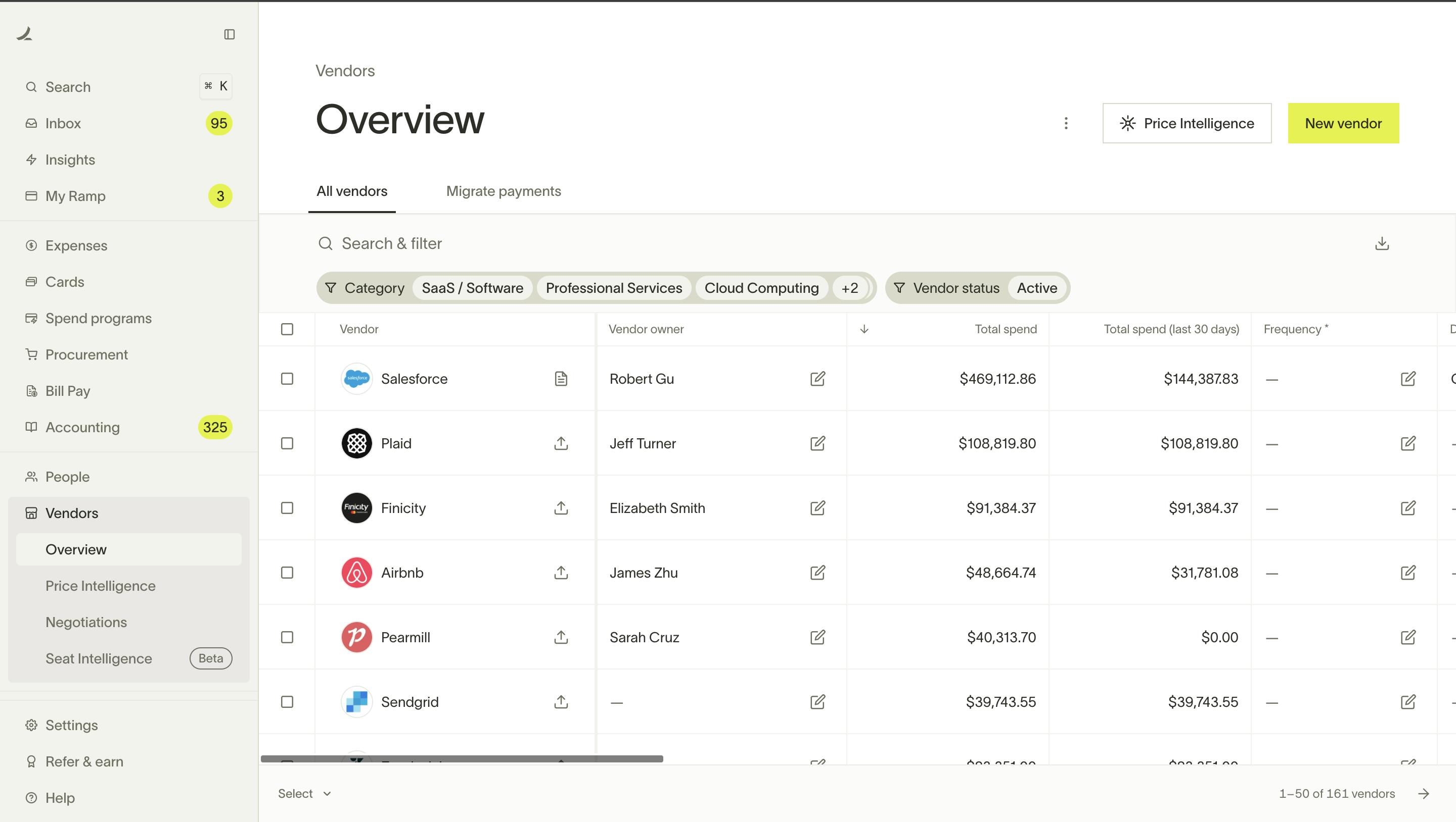 Ramp also has a Price Intelligence feature that is accessible through the Vendor Management Tab. It uses “spend data from thousands of Ramp customers and millions of Ramp transactions” to give users the ability to compare what they’re paying for software against others.