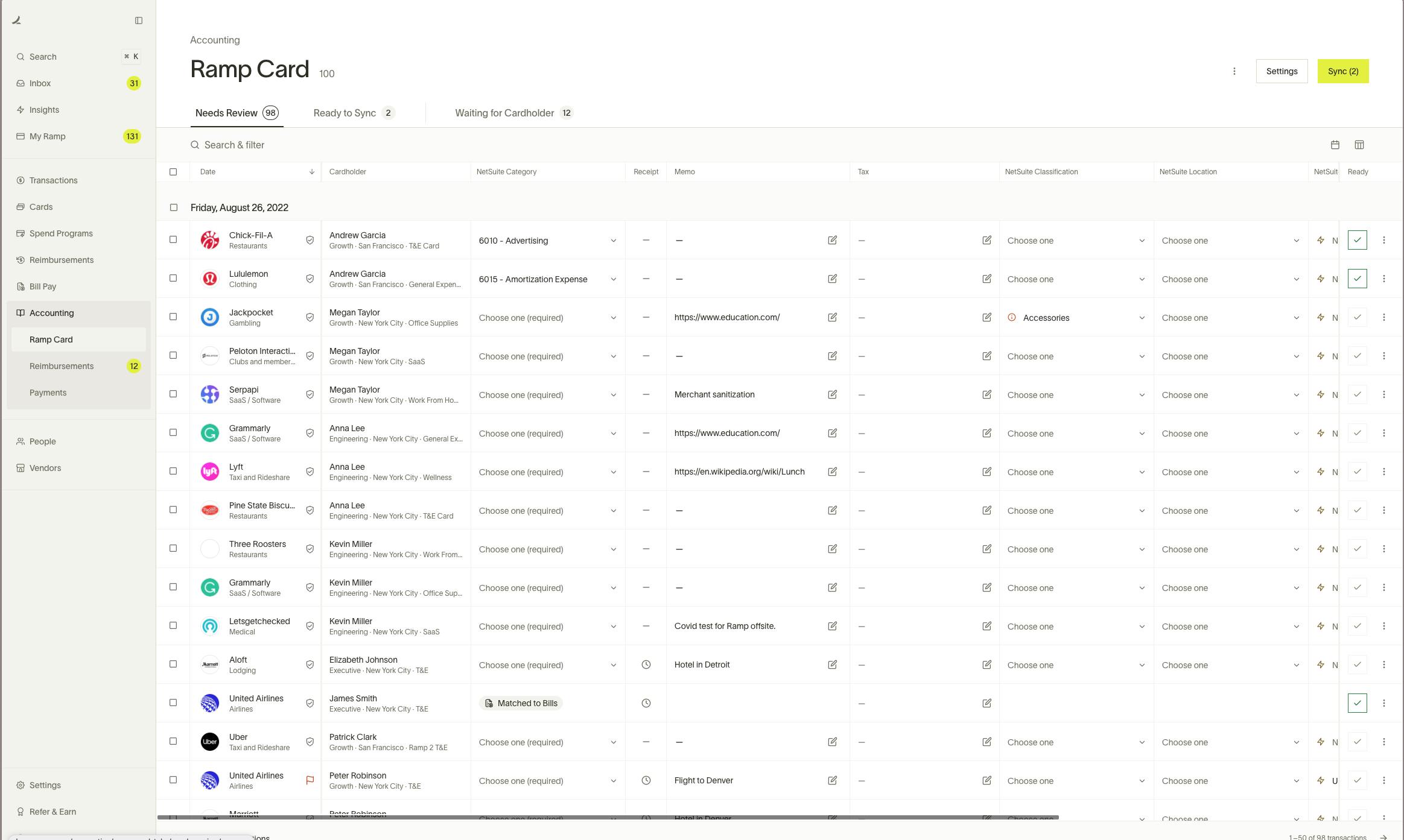 Once a customer is connected to accounting, Ramp pulls in cleared transactions and approved reimbursements. A transaction can then be coded and exported to a desired format. Universal CSV offers the ability to import any field from an accounting provider to be coded within Ramp, an open text field that allows bookkeepers to fill in according to company policies, and a “required field for syncing” which ensures that data can be reconciled between platforms.