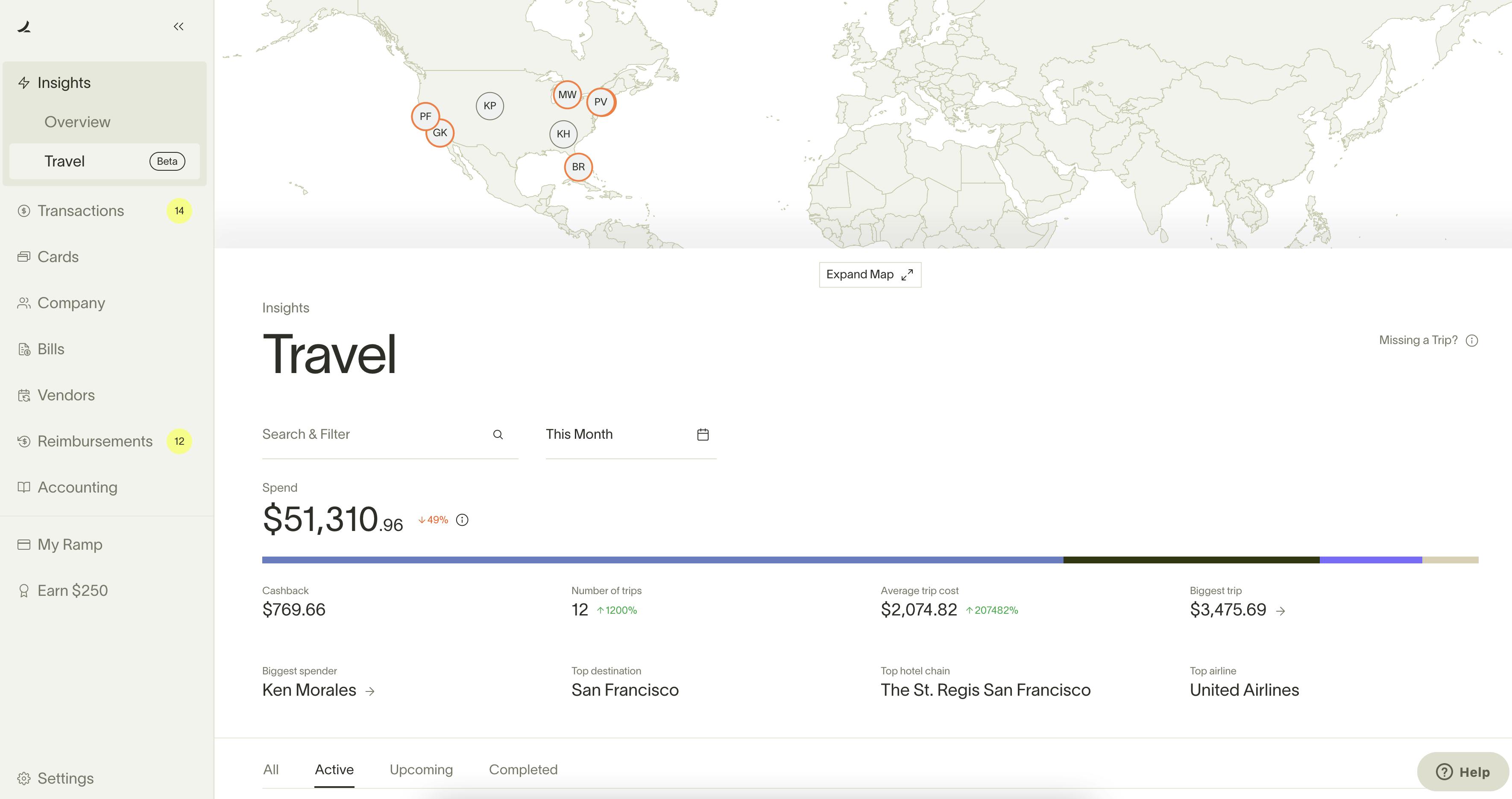 Ramp’s Travel Dashboard enables customers to see company travel spend and details live. There are three main sections:
