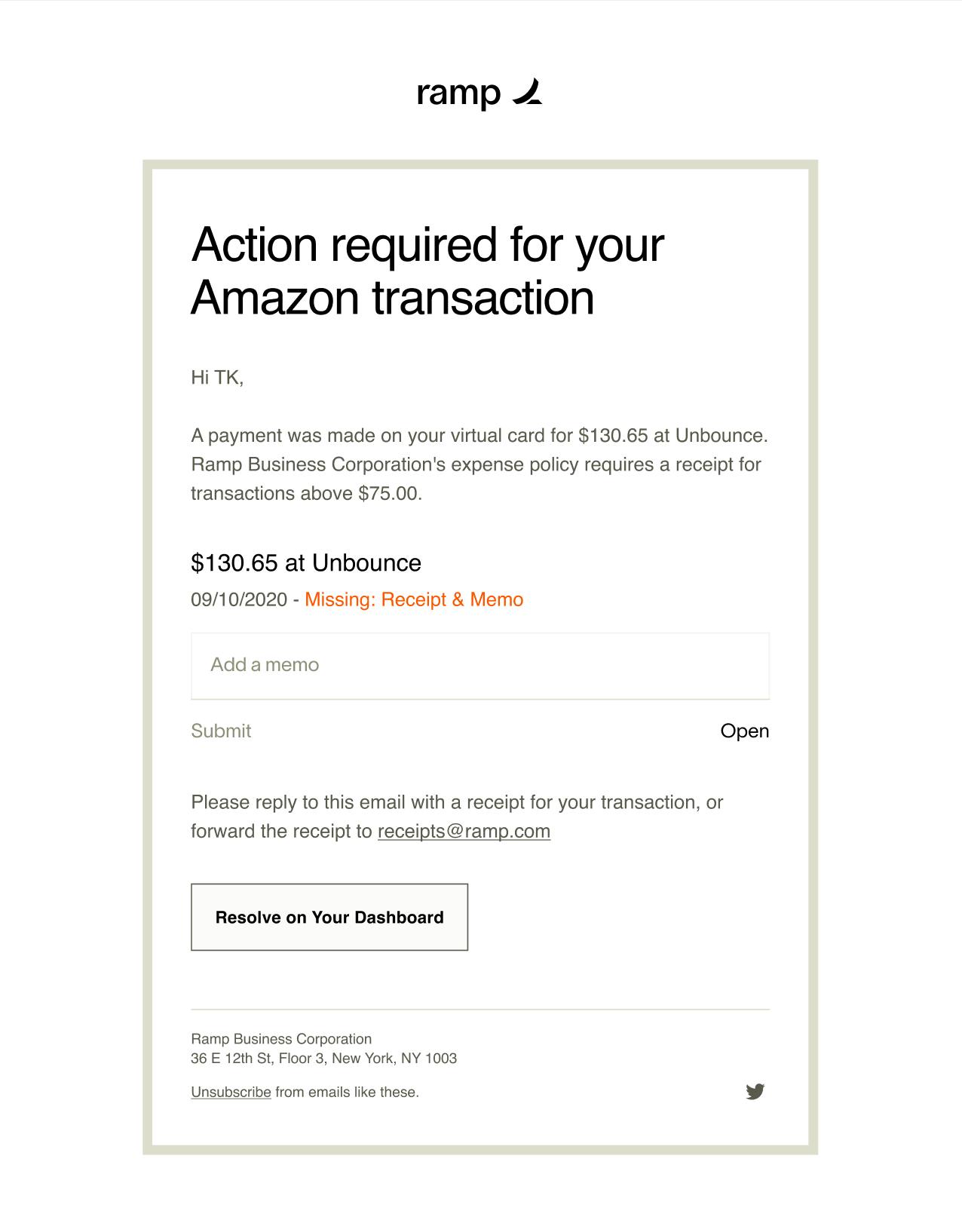It also aims to send triggers right at the time following a transaction which is intended to ensure easier and more timely transaction logging. Ramp's software is therefore intended to make expense management as simple as it can for the individual user. Further, when a user spends with their Ramp card, if a receipt is required, they can attach it alongside any relevant notes or categorizations as a memo via several different options like SMS, email, Ramp.com, mobile app, or Slack integration.