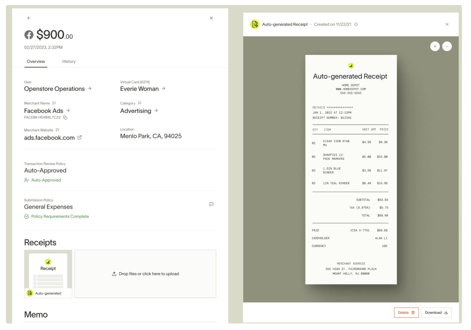 Often, when expense management software is divorced from transactions themselves, users find themselves with a pile of receipts each month that need to be input into the software manually. To prevent this, Ramp focused on building more robust optical character recognition (OCR) to automatically ingest even the hardest-to-read receipts to achieve over 90% accuracy.