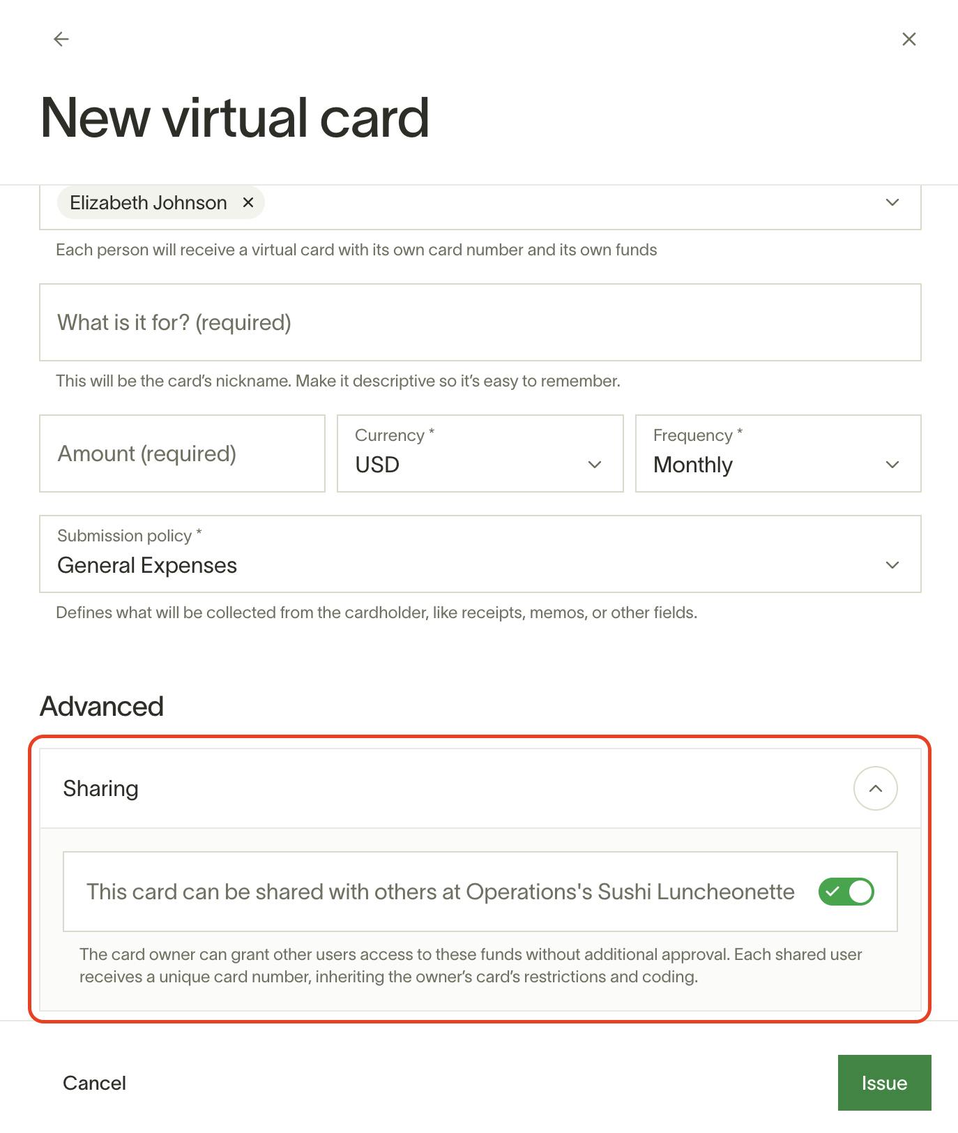 “This feature allows admins to issue or employees to request limits that multiple employees spend towards for a specific purpose with their own cards.”