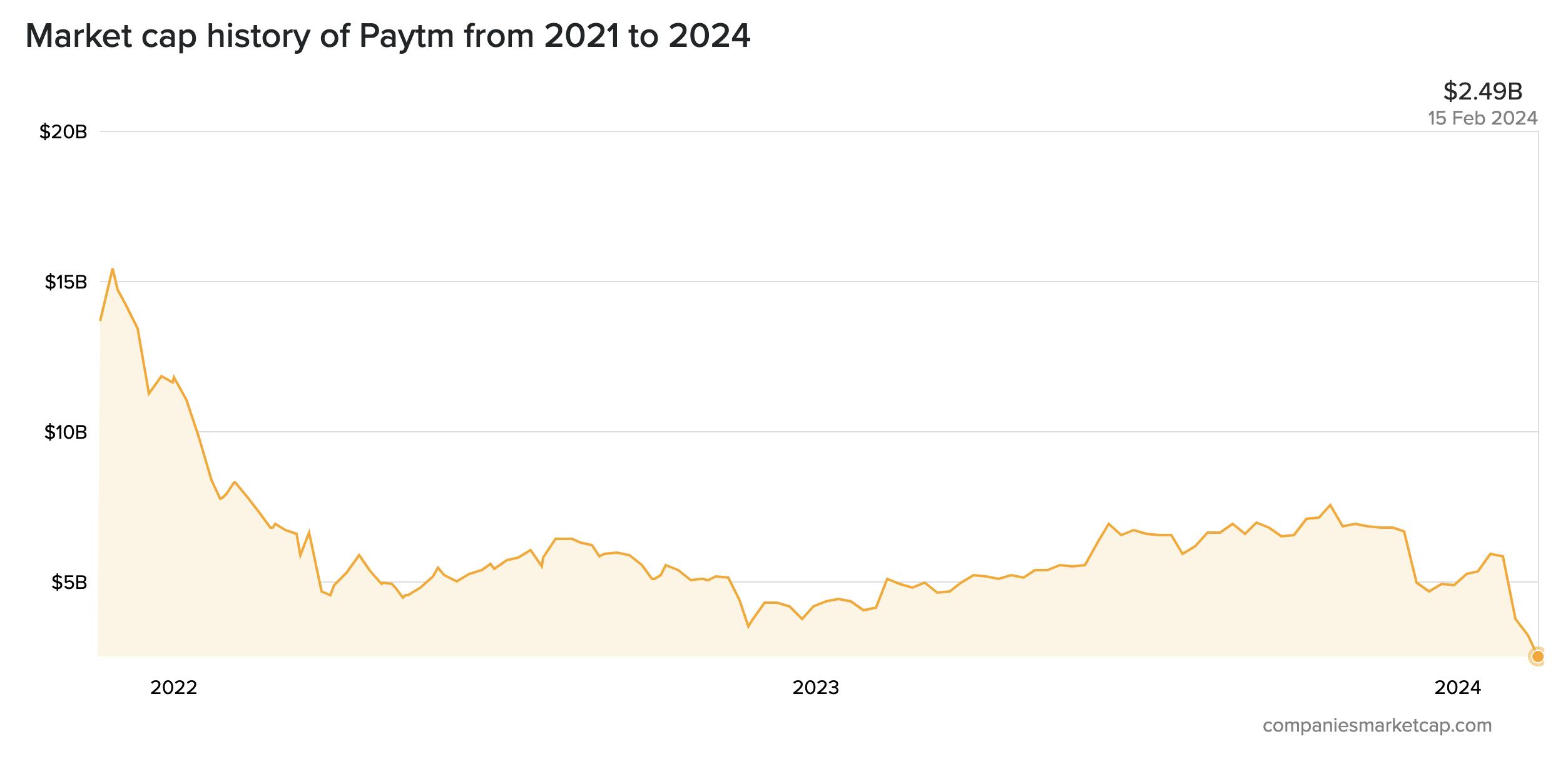 Comparable public companies, like Paytm, have seen significant reductions in their market cap. Paytm has dropped from a high of ~$15 billion in late 2021 to a market cap of ~$2.5 billion as of February 2024, off of ~$1 billion of revenue.