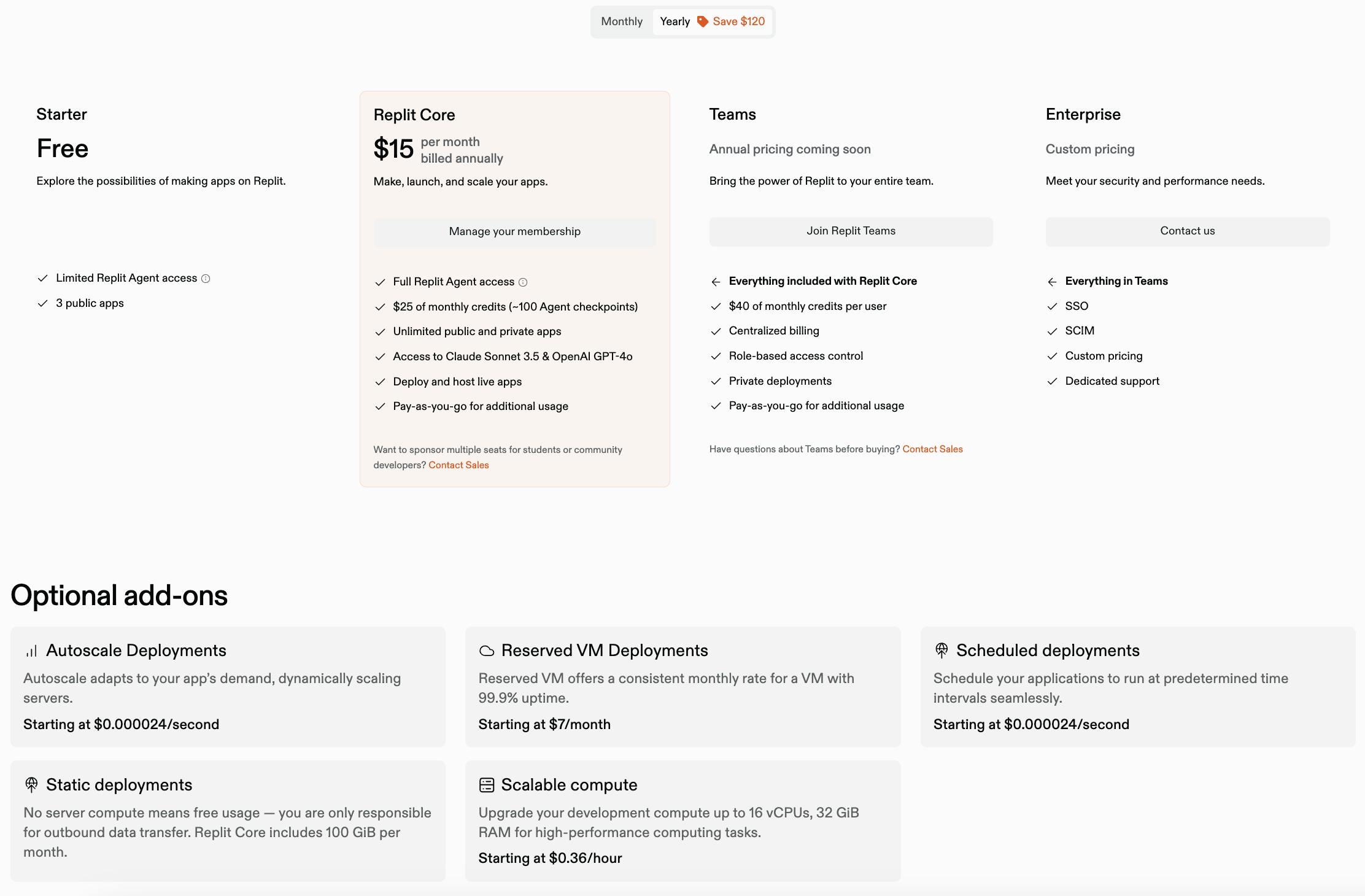 Replit generates revenue through monthly and annual subscriptions. In August 2023, Replit announced changes to its pricing plans citing continued product upgrades, such as deployments, and access to other databases like PostgreSQL. In November 2023, Replit announced its transition to Replit Core, a combination of previous tiered memberships Hacker and Pro, to create a single membership for all Replit builders. As of August 2024, Replit leverages a variety of pricing plans for individuals, businesses, and teams, across certain types of storage, performance, and functionality. Replit also has additional pricing around Replit Deployments.