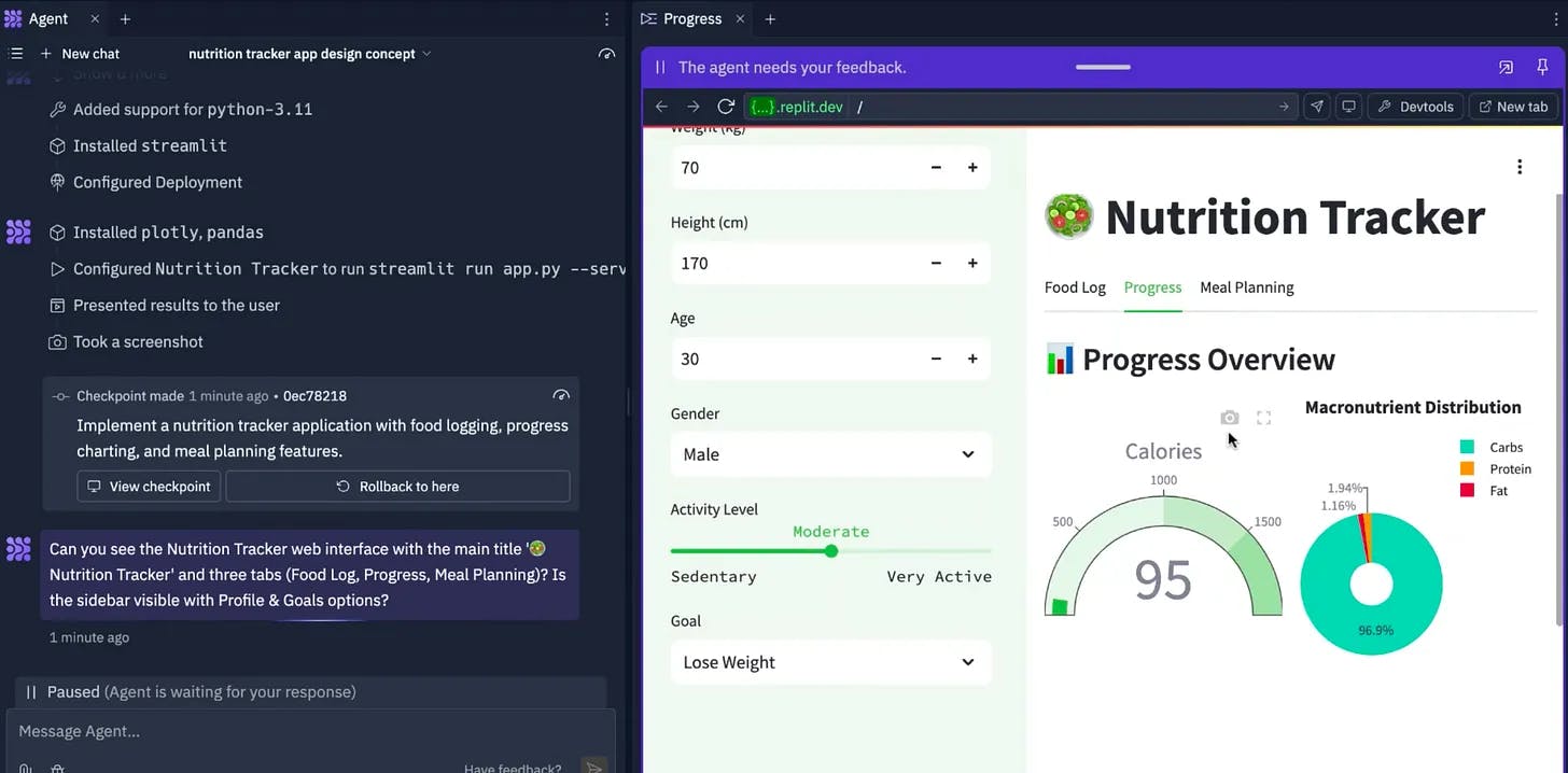 Plan Approval: Once a prompt is submitted, Replit Agent provides a high-level summary of the plan it proposes to execute, including specific languages, packages, and approaches to building the desired application. For example, it may pick Streamlit, an open-source Python framework, based on the requirements of the project. The user can respond, requesting React as a new plan, or approve the recommended approach.