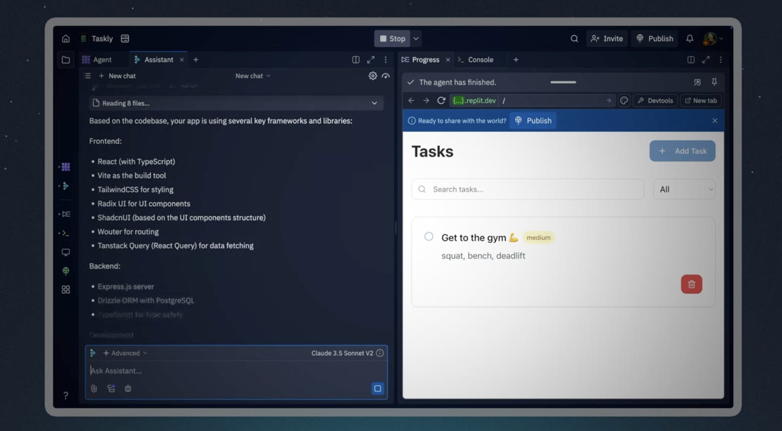 Database Creation: For many code generation applications, this is where the process would end. Replit Agent can create “databases, determine deployment needs, handle migrations, and manage integrations.” Databases such as Postgres, as well as object storage and Replit Key-Value Store. In February 2025, Replit announced the launch of its database editor, enabling users to manage their databases “with the ease of use of a spreadsheet.” As Replit CEO, Amjad Masad, explains:
