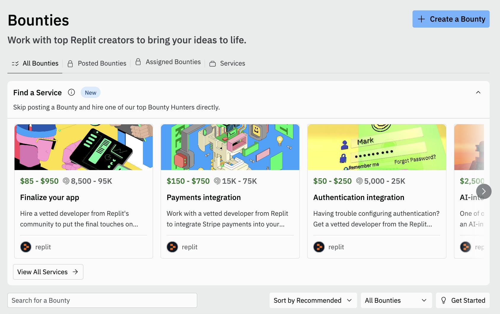 Replit announced Bounties in December 2022, a creator marketplace where Replit users can post a bounty where they describe what they need in order to receive submissions from the Replit community who attempt to solve the original problem in exchange for that bounty. As of February 2025, the Bounties product isn’t as big of a priority on the Replit website. As Amjad Masad explained in February 2025: