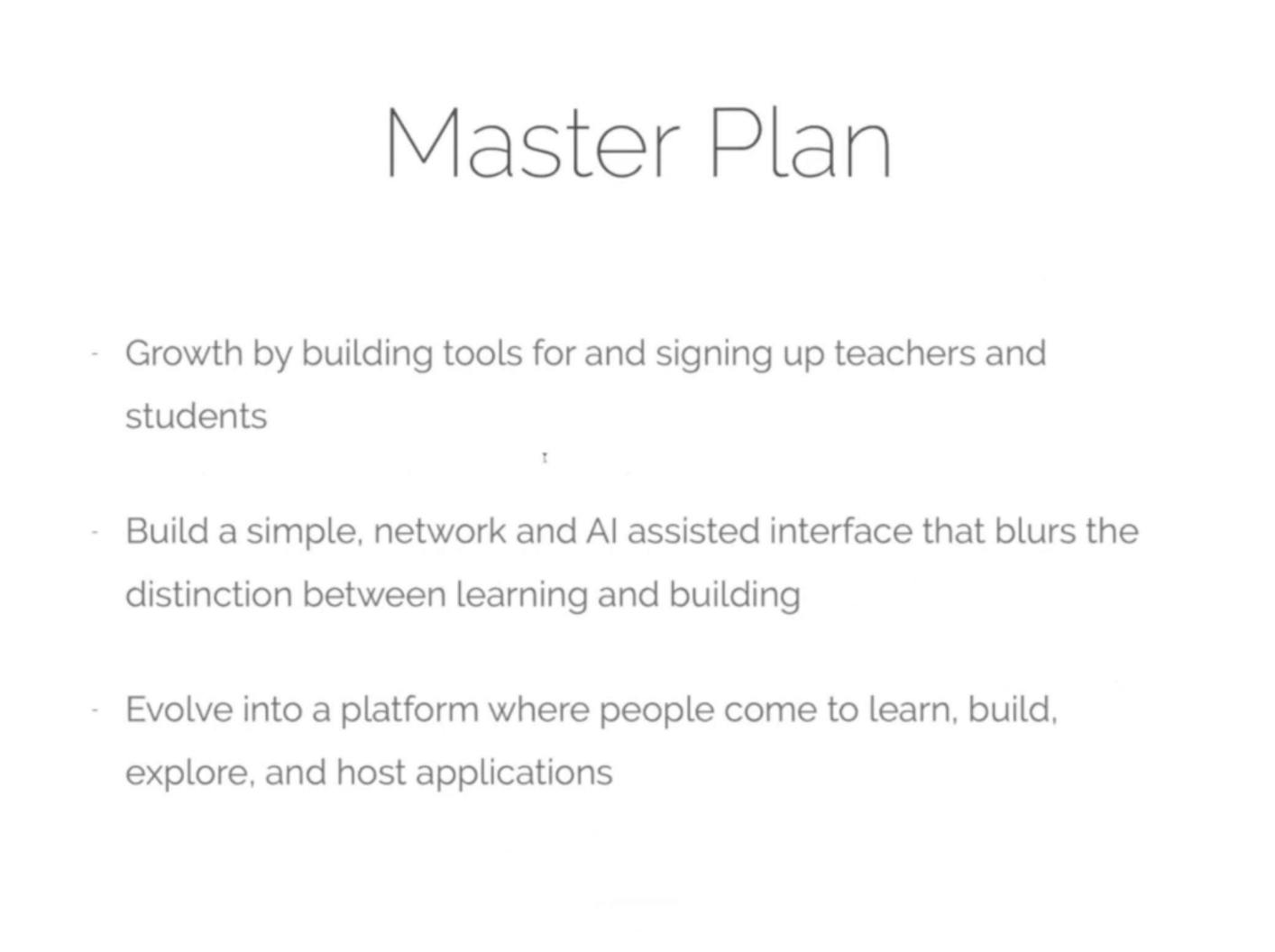 From the very beginning, Replit had AI as a central focal point of its product. In the company’s pitch deck for raising a seed round in 2016 it included a slide where the master plan was building an “AI assisted interface that blurs the distinction between learning and building.”