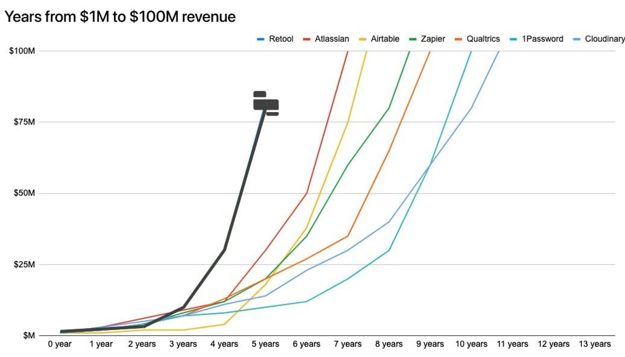 Retool has scaled its revenue rapidly, crossing the $75 million ARR threshold within five years of founding according to an unverified third-party source. Retool reported in December 2021 that it was cash flow positive. It strived for efficient growth from the beginning having had several million dollars in revenue when the team was just four people.