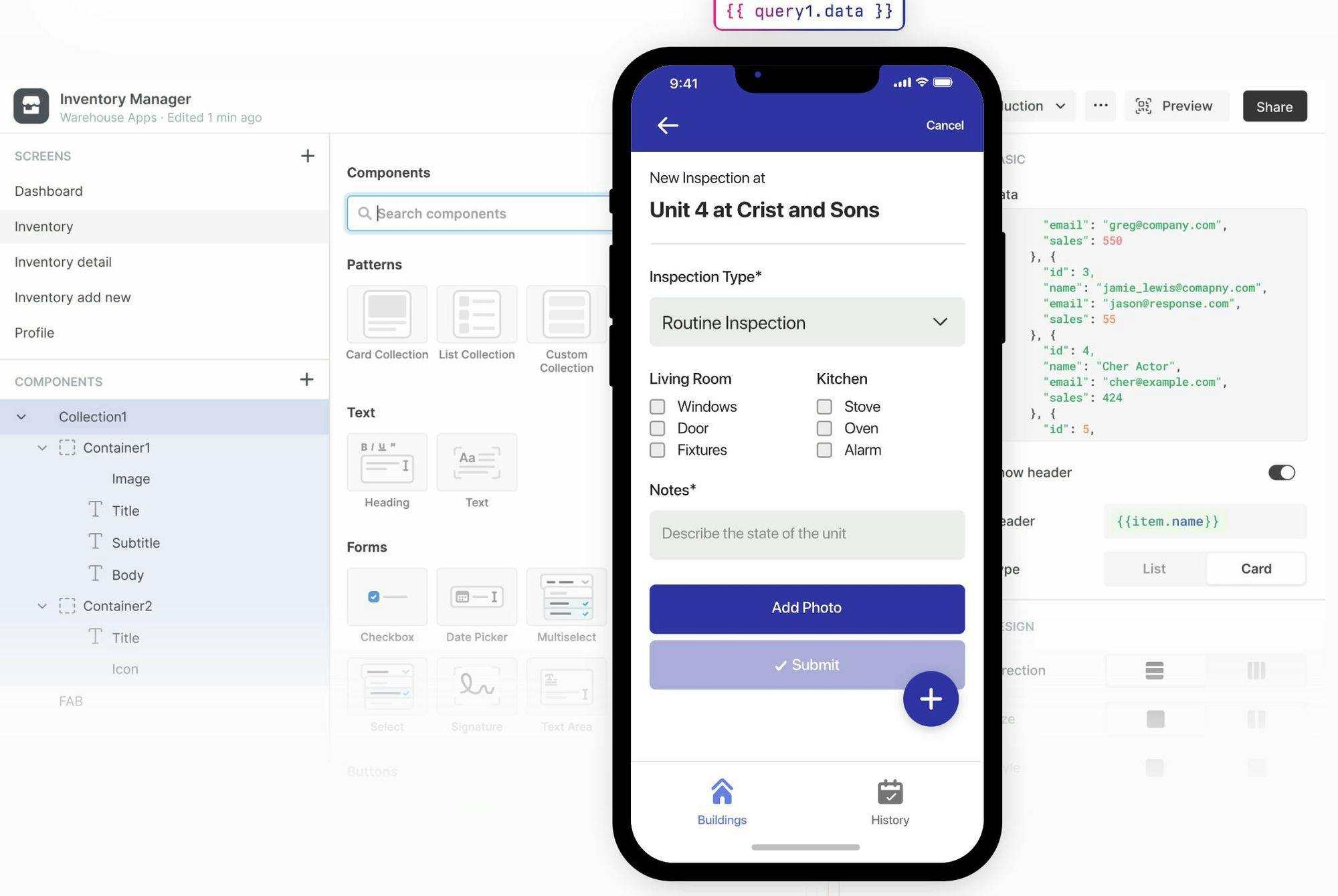 Components: Components act as the building blocks for building web applications in Retool. Building UI elements from scratch is a tedious task, so Retool provides over 100 of them out of the box (with room for customization). Each component exposes properties and events developers can access and interact with via code.