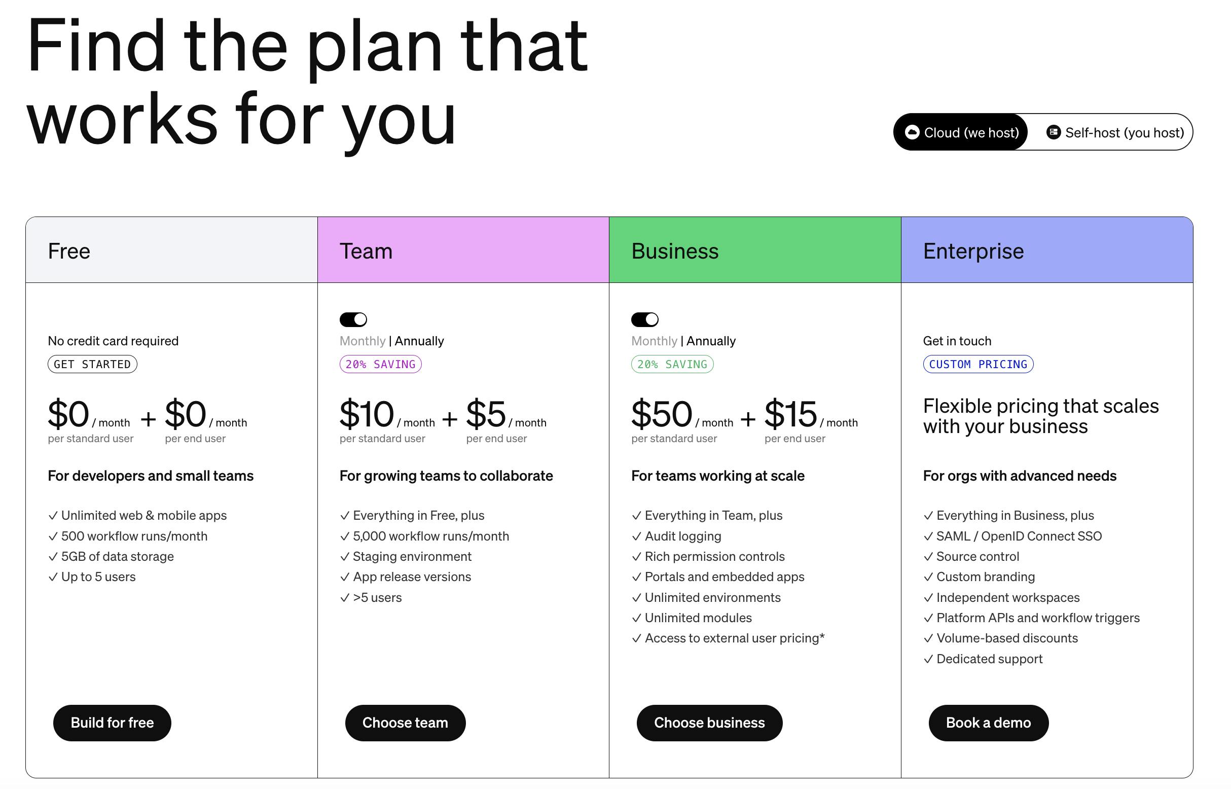 Retool offers a tiered, per-seat software subscription pricing model. In 2023, it rolled out an updated pricing model to distinguish between end users (consumers) and standard users (builders). The move was meant to democratize the ability to build and share applications at scale. Retool offers $25K in free Retool startup credits through the Retool for Startups program. This allows for quick capture of high-potential, fast-growing startups early and helps to grow alongside them.