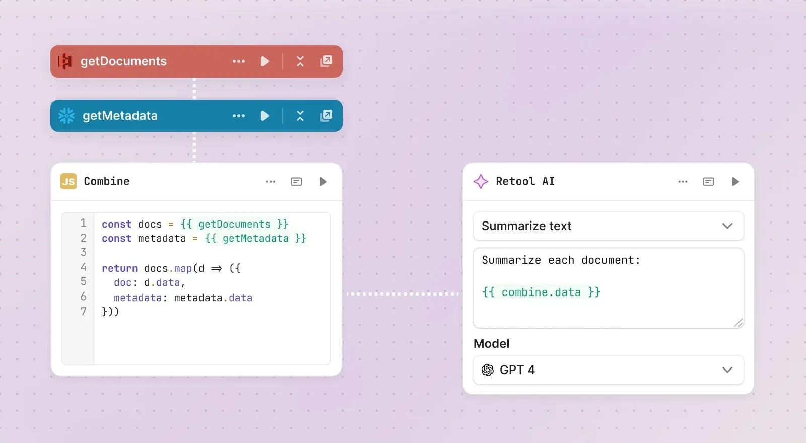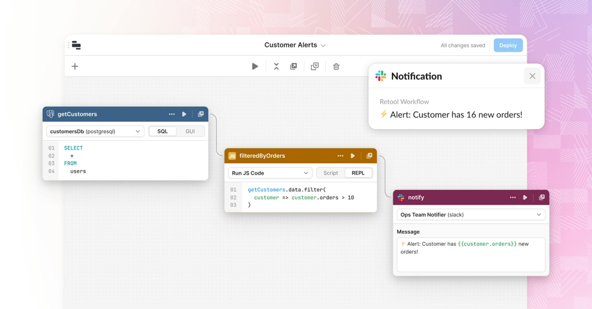 Retool Workflows is the visual backend for building cron jobs, custom alerts, and ETL tasks. Similar to web applications, workflows are built off the concept of blocks, which can be stitched together as a series of steps to perform business actions. The workflows can read and write from the existing resources provisioned, allowing for in-line Javascript and Python development. Workflows extend the functionality of Retool, allowing for asynchronous jobs that can be scheduled and invoked via a webhook.