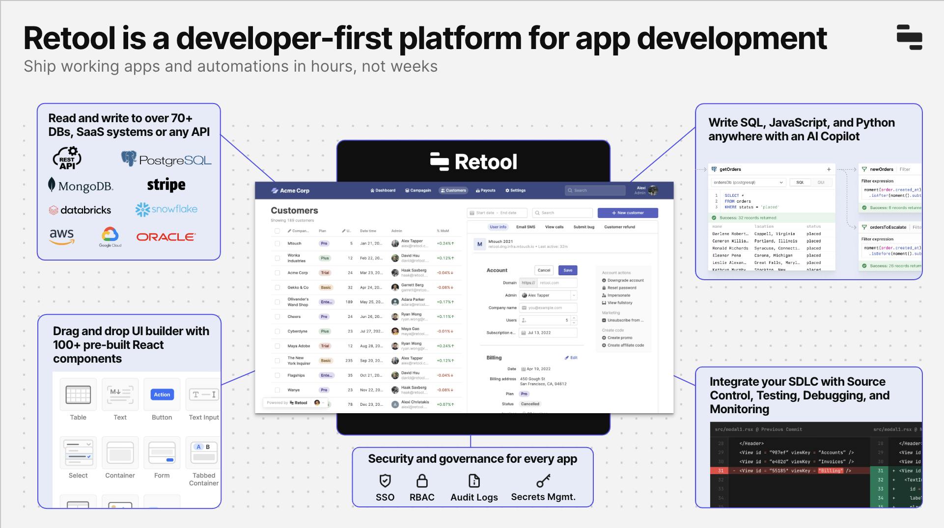 Retool is a developer tool built to streamline operations via a low-code development platform. It abstracts away the foundational, yet tedious work of building applications, including hundreds of out-of-the-box components to spin up a web app, a series of complementary backend and external facing products, and a suite of enterprise features (like granular access controls, custom SSO, and audit logging). Retool provides a development environment to quickly build full-stack applications, allowing engineers to focus on shipping against their customer-facing roadmap, rather than prioritizing, haggling with, and iterating on operational tooling.