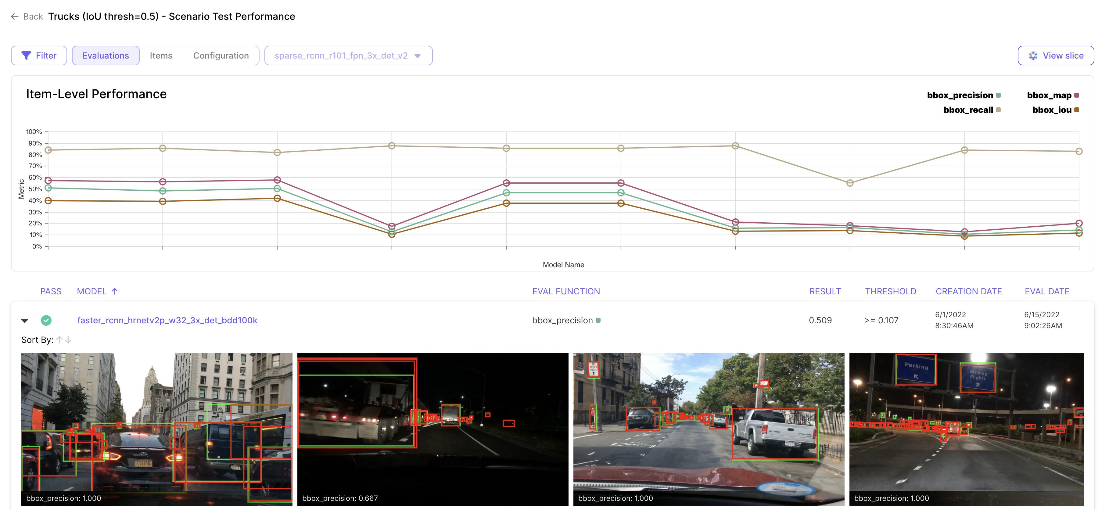 In the scenario tests view, a user is presented with the ability to regression test the models that they are using. Regression testing ensures that the quality of the model does not degrade over time, or with the addition of more dataset items. A Validate ScenarioTest is used to monitor model performance in key scenarios. It operates on a subset of data (Slice) and includes various evaluation metrics. Users can compare the model's performance against baseline models or evaluate if it meets specific thresholds, such as checking if the IoU of a model is greater than 0.8 on the selected data slice.