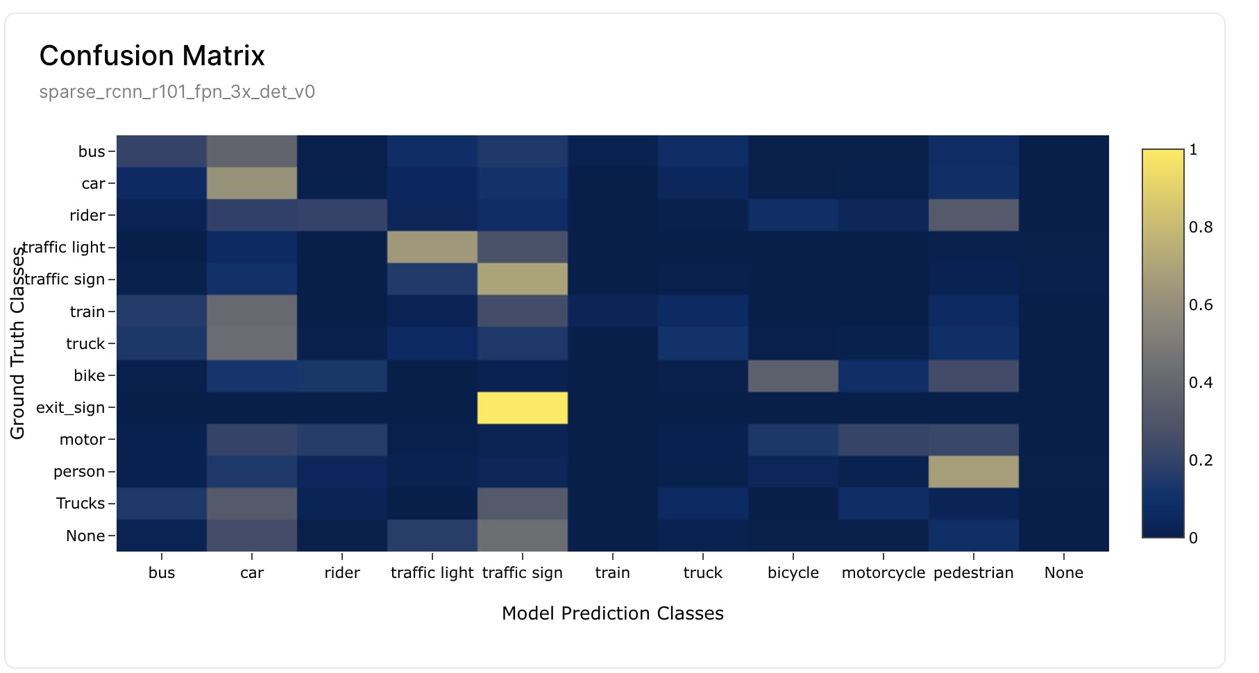 Confusion matrices are a powerful tool for understanding class confusion in models. They compare predicted and actual classifications, helping to identify misclassifications, such as predicting a traffic sign when the ground truth is a train.