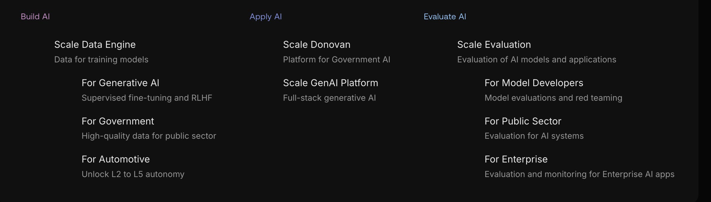 Scale AI’s core products include Scale Data Engine, Scale Donovan, and Scale GenAI, while Scale Evaluation is embedded into the workflows of these three products.