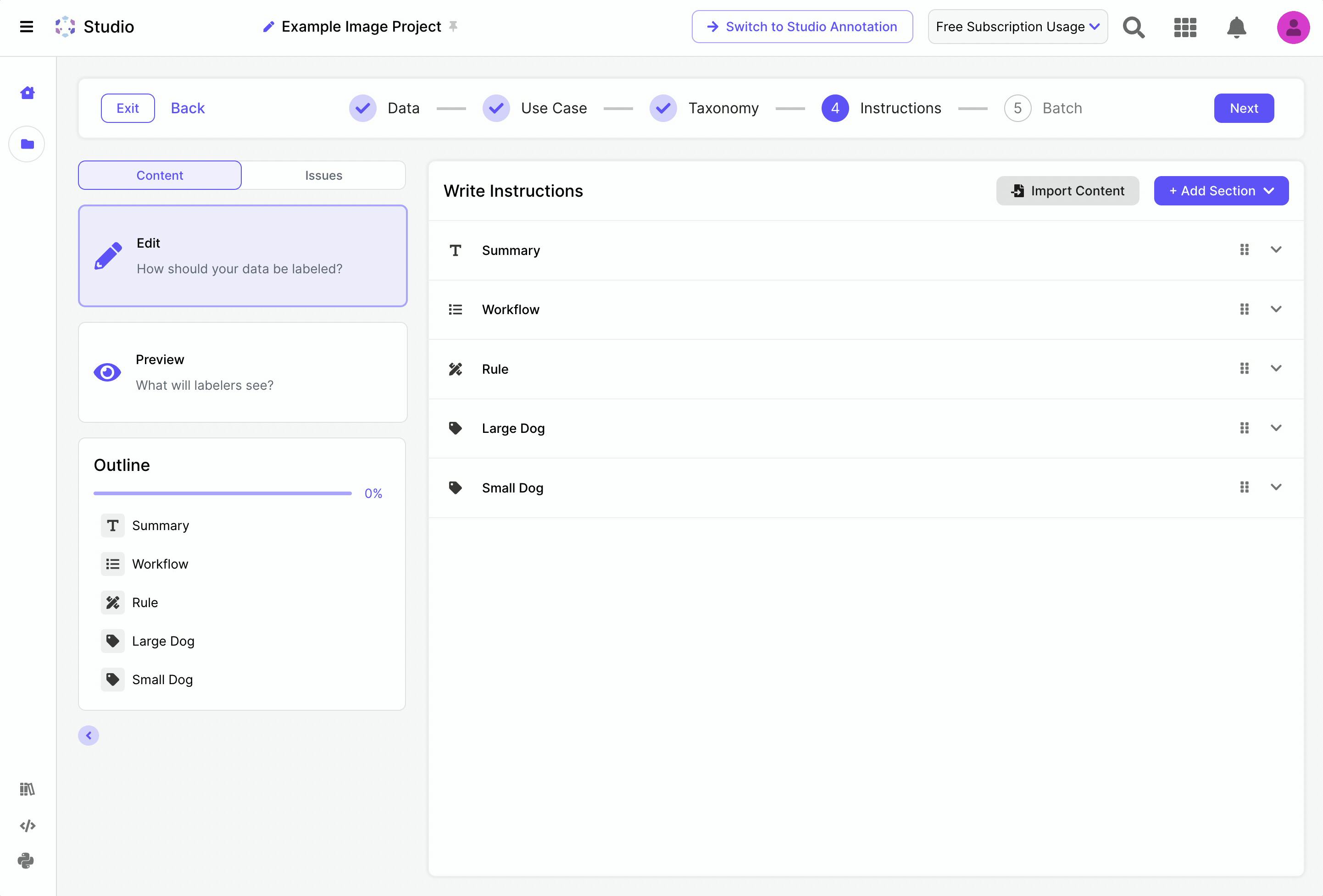 These instructions guide the labelers on how to handle each task accurately. After creating the taxonomy an auto-generated instructions outline is created. In each case, whether the project is net-new or based on a template, it includes the following sections: