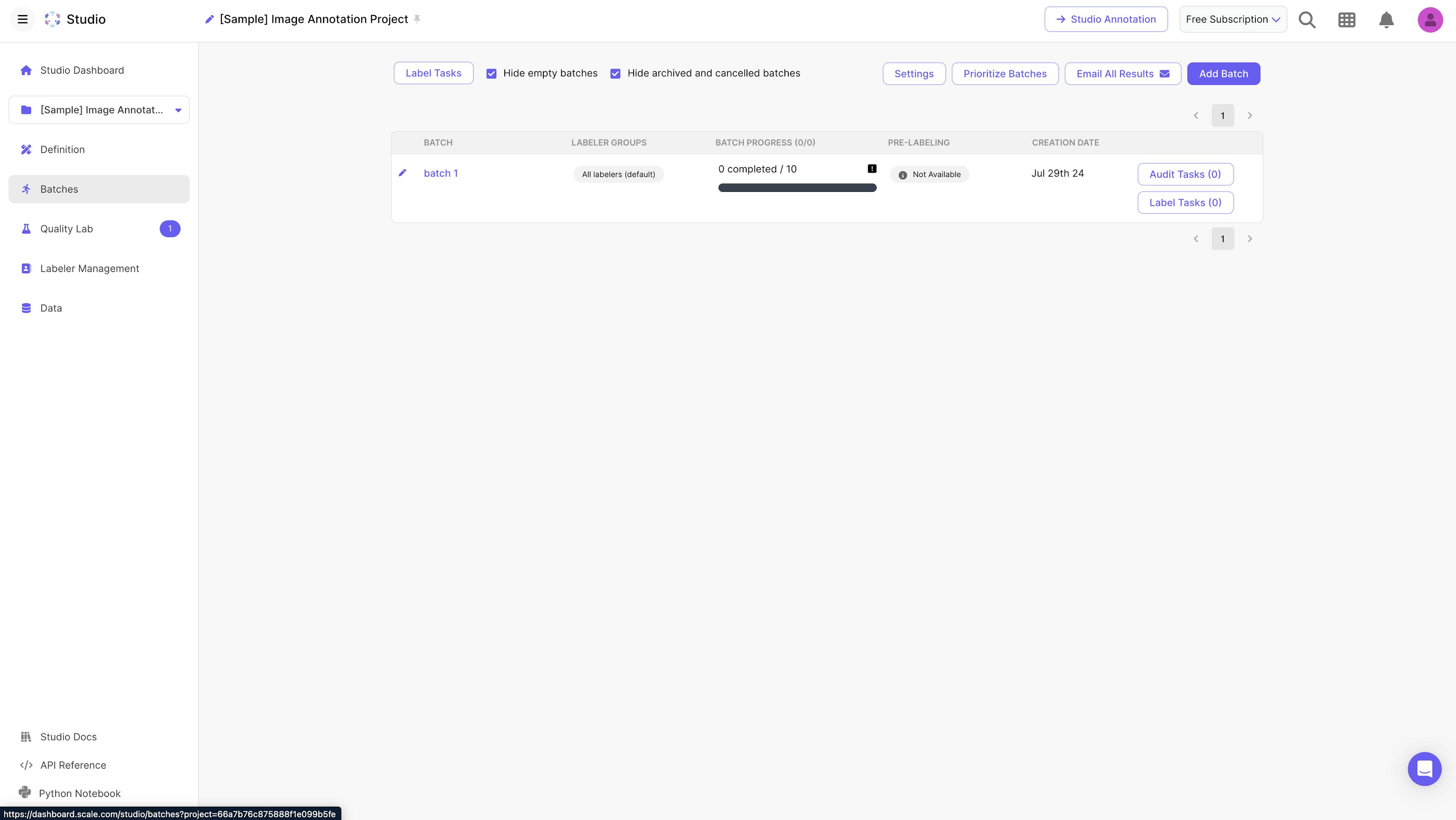 Batches: On Scale Rapid, projects allow batches of data to be launched to the Scale workforce for labeling, with three types of batches available: self-label, calibration, and production batches. On Scale Studio, projects enable batches of data to be labeled by a customer’s in-house annotation team, with all batches being standard production batches that can be used for various purposes such as self-labeling, experimental batches, or large-scale production pipelines. On Scale Pro, batches can be used to further divide work within high-volume projects, associating tasks with specific internal datasets or marking tasks as part of a weekly submission.
