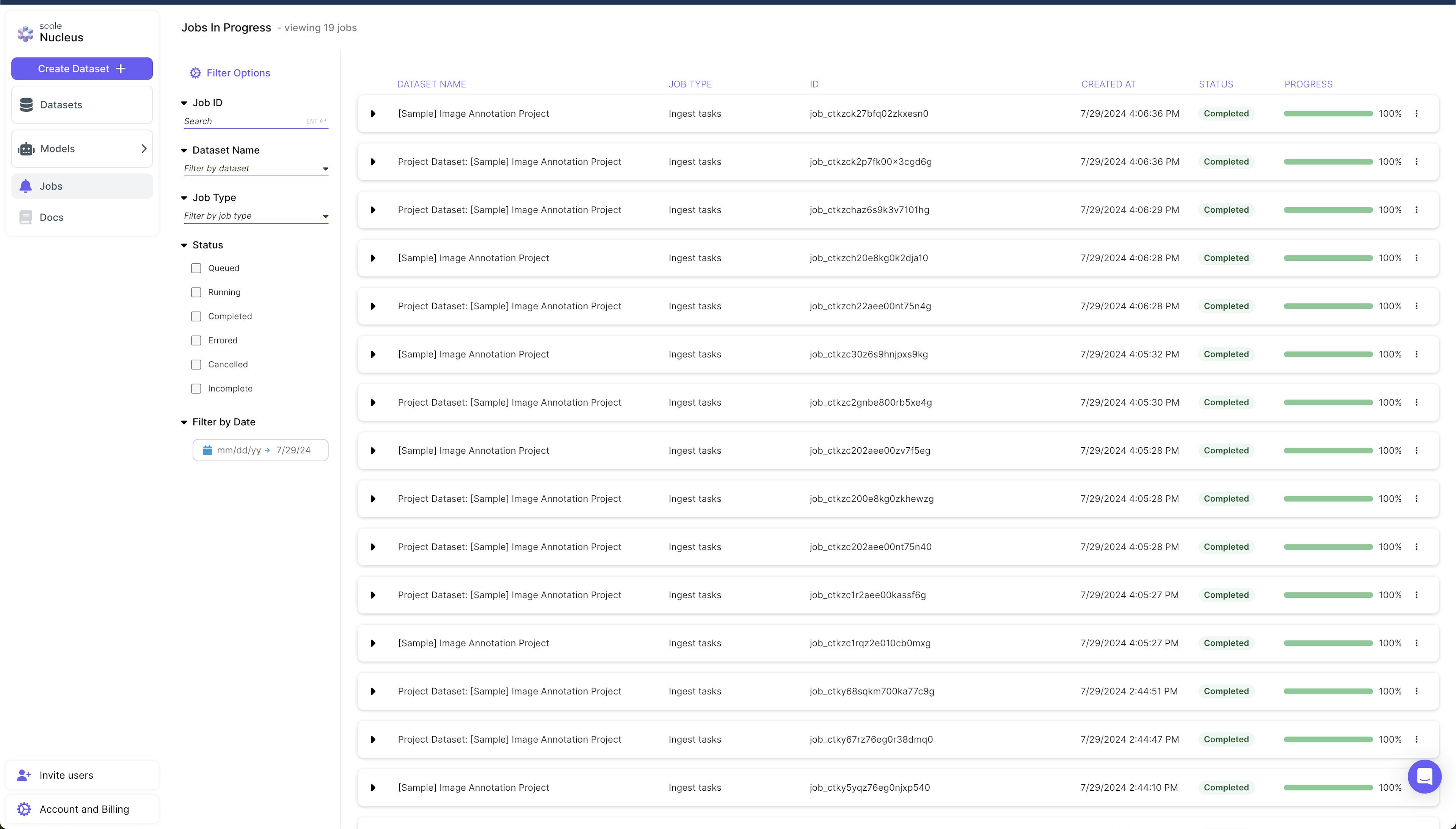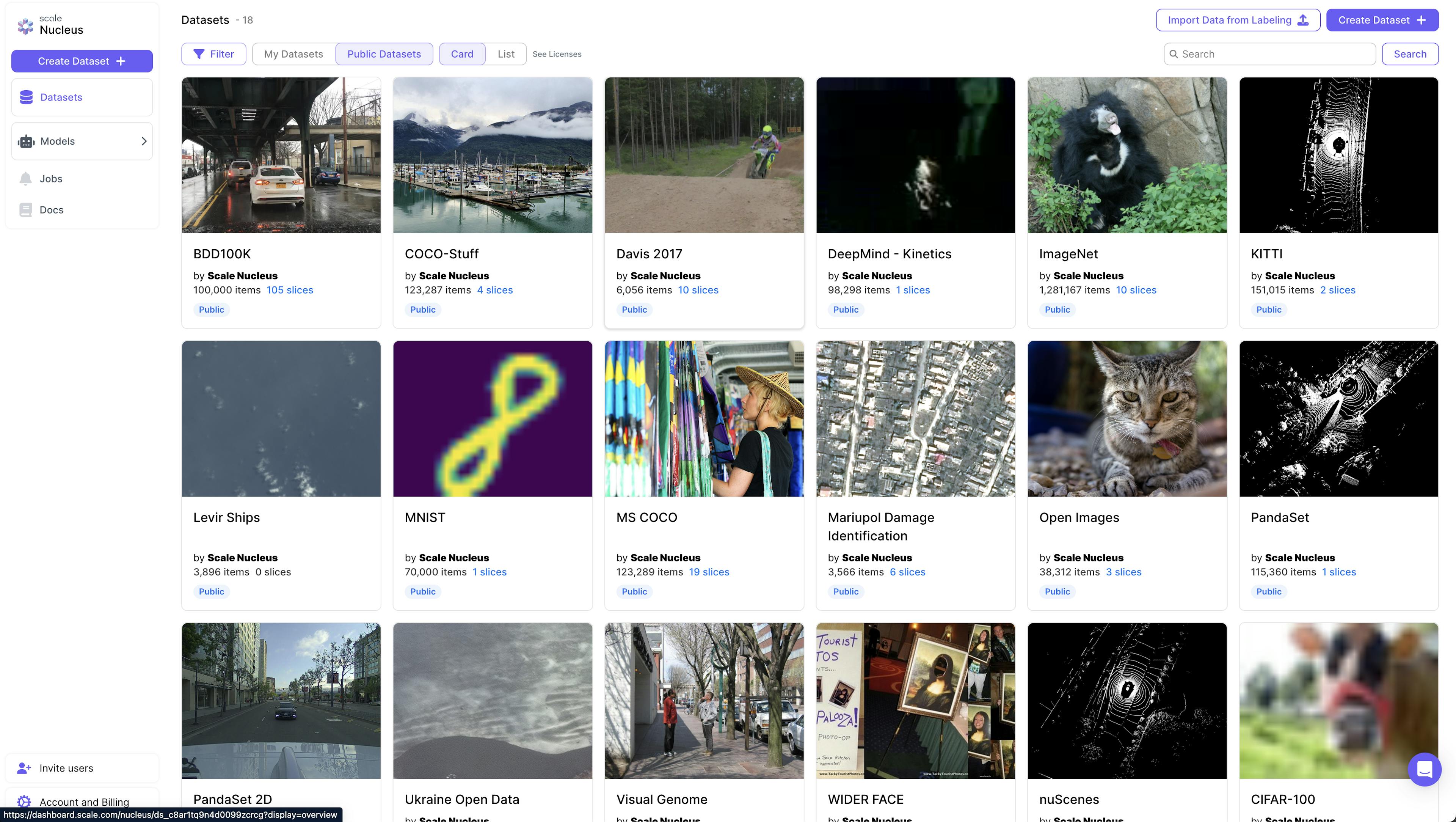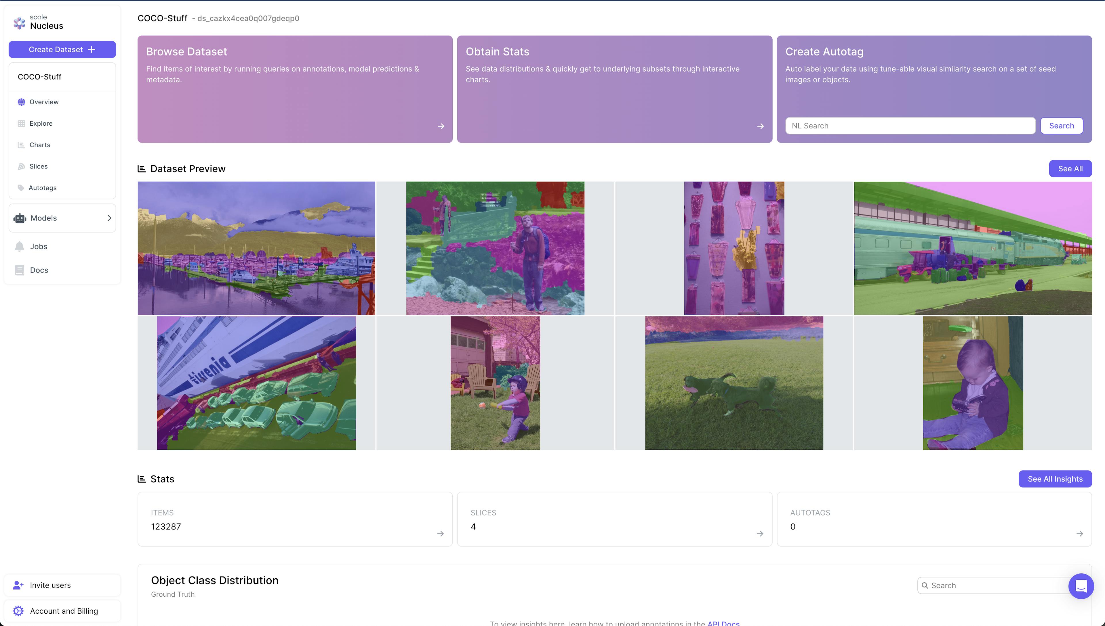 The Nucleus dataset dashboard contains all the datasets associated with a user, whether that be public or private. As a user clicks into a dataset, there’s a dashboard view that provides an overview of the contents of the dataset and statistics associated with the dataset. These datasets can be created by importing images/tasks that a user already has in Scale, via the command line interface, or via the platform’s UI.