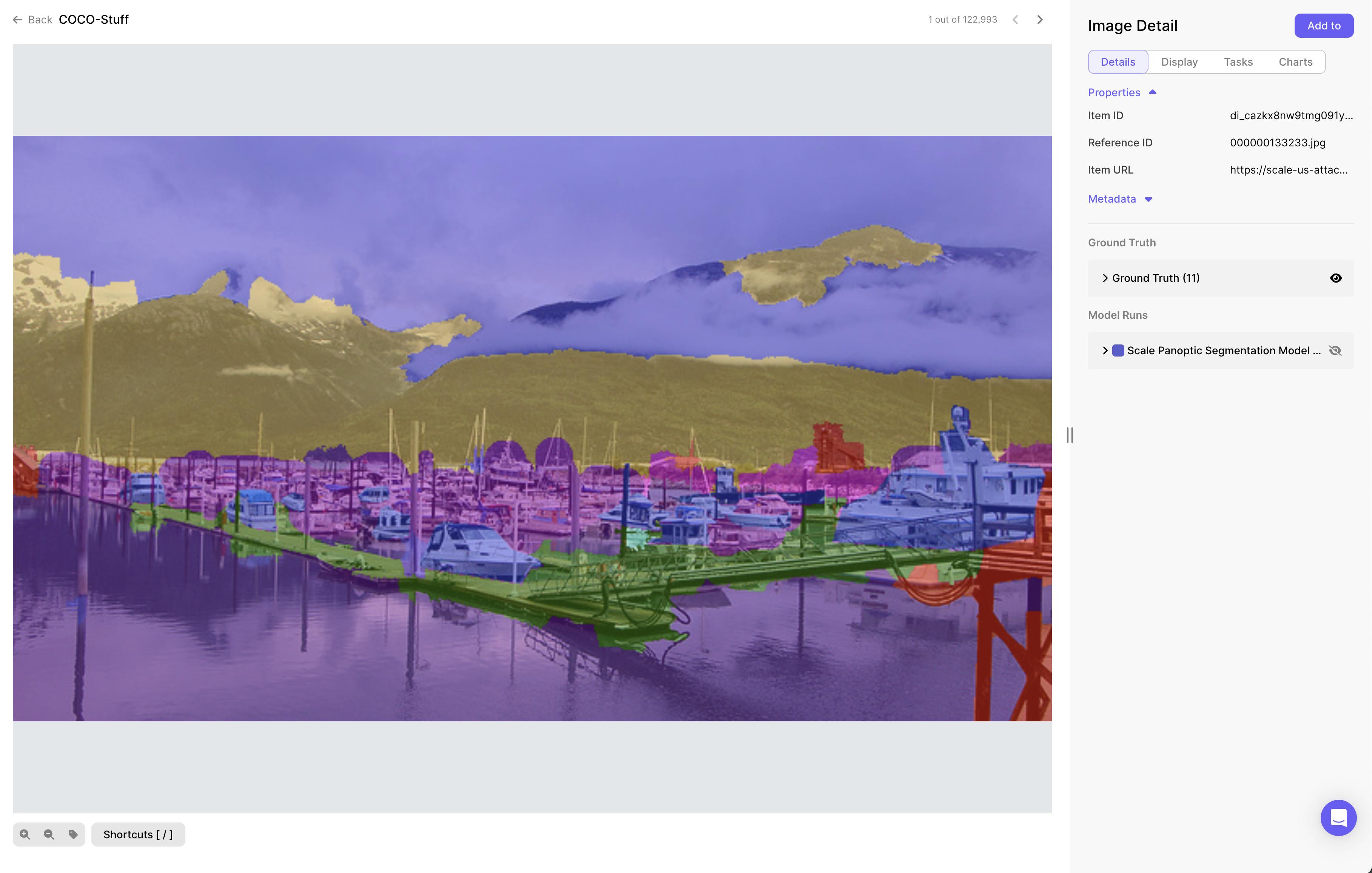 When each of these pieces of the dataset is clicked on, more data on the dataset item is provided on the right-hand side including the item properties, metadata, display of the annotations, or effects applied to the item. Whether there are any associated tasks associated with the specific item, and any charts, or statistics that the item might be a part of.