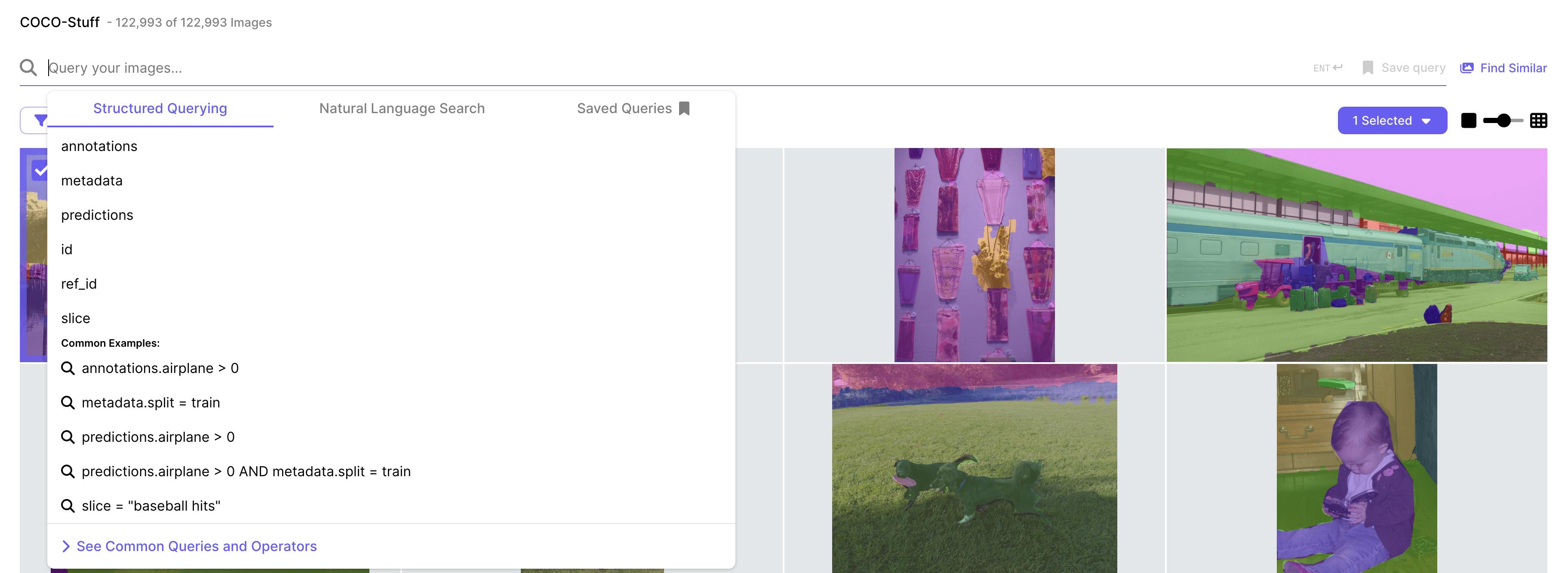 This functionality applies to all datasets, regardless of their image content, though the quality of the results may vary. Unlike structured querying that depends on annotations, autotags, or predictions, natural language search allows users to search their datasets using natural English. Users can search by similar items in this view, by selecting an image and clicking “Find Similar”.