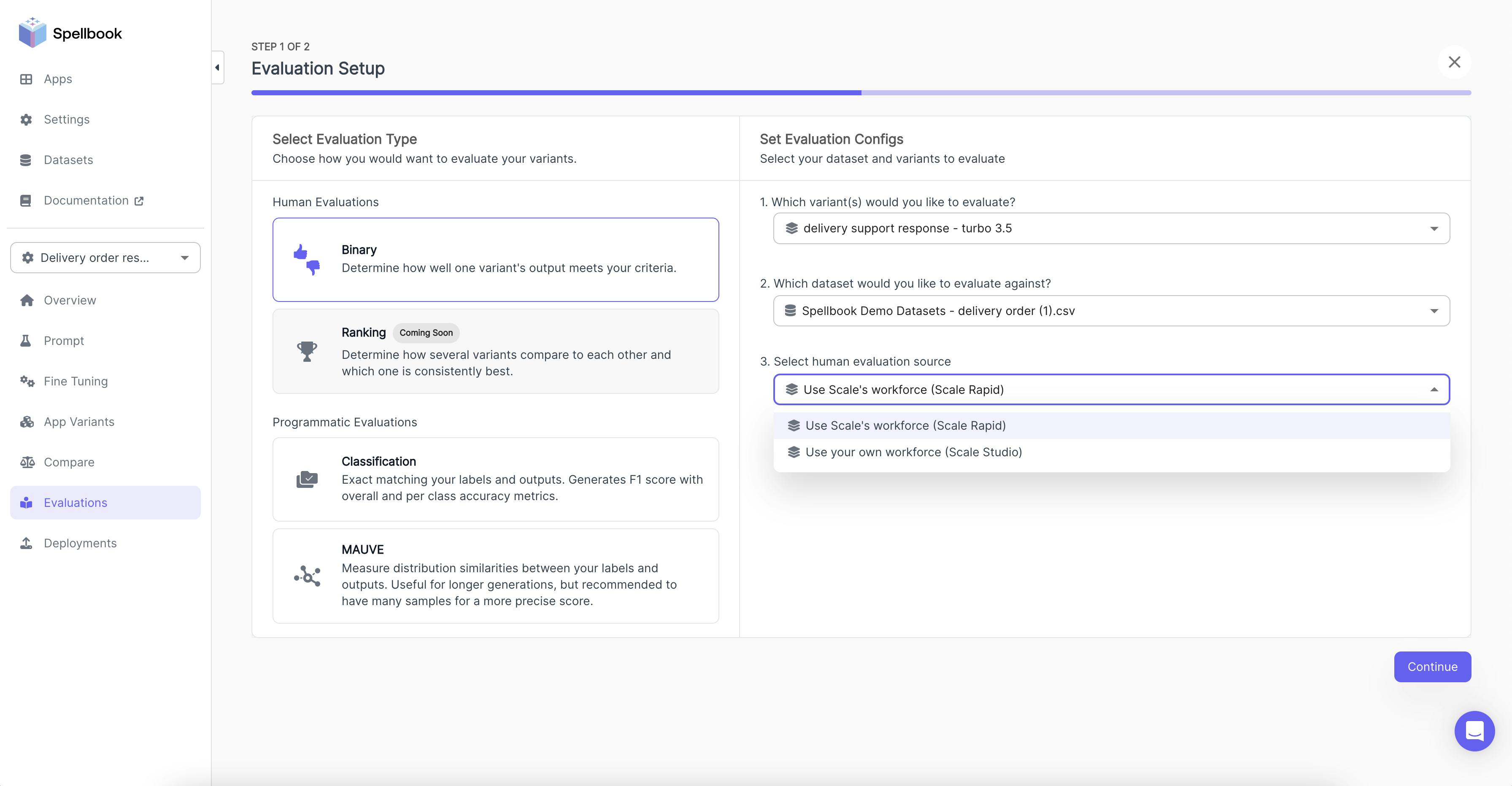 Evaluations in Spellbook provide quantitative metrics to determine the best variant for specific use cases. Options include Human Evaluations and Programmatic Evaluations. For generative applications, users can employ Scale's human evaluation integrations. They can select a variant and a dataset with at least 20 rows, choosing between Scale's global workforce or their internal workforce. Users must define the task and evaluation criteria for the human evaluators.