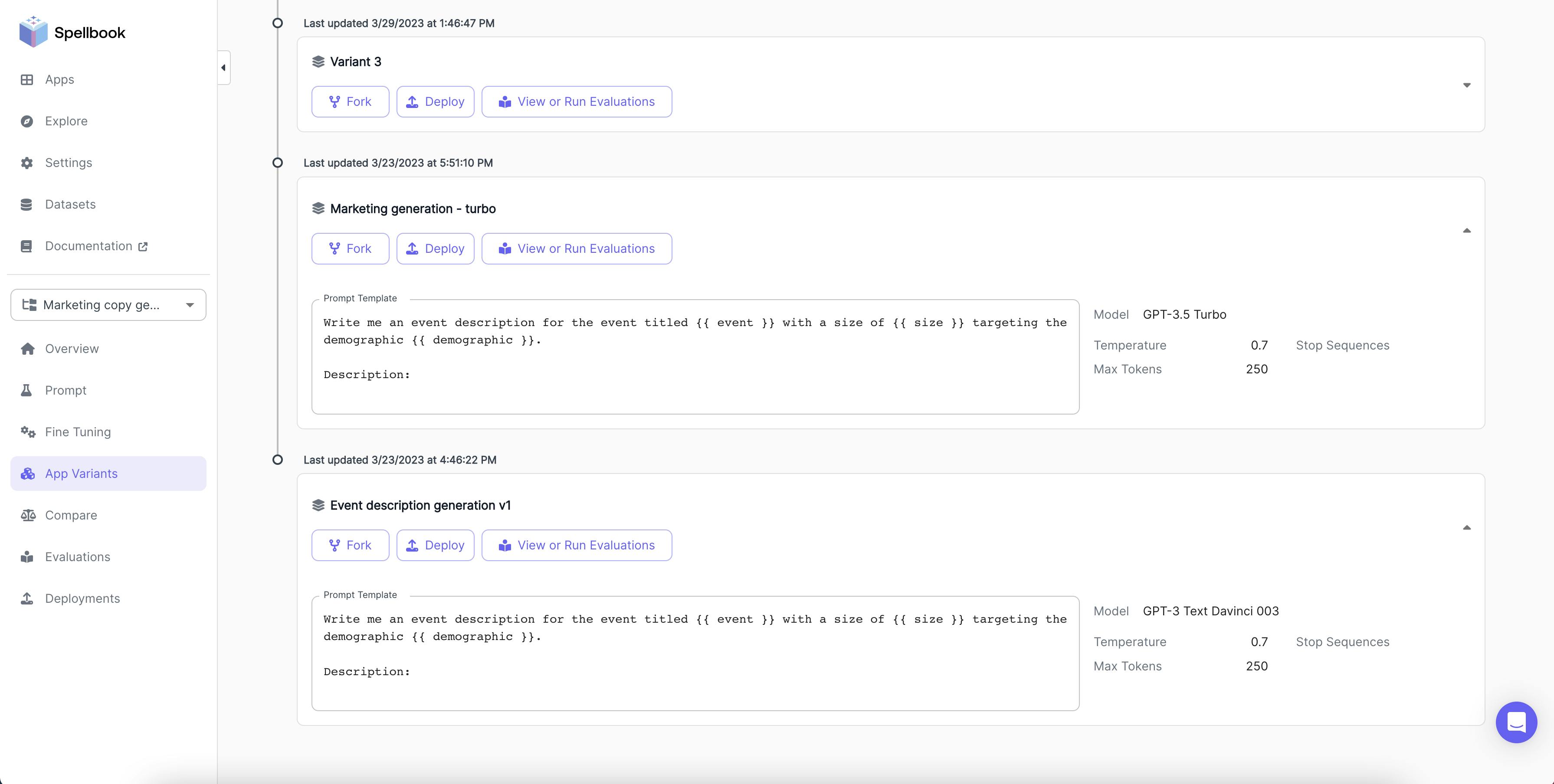 Different versions of the created app can be viewed on the App Variants page. They can also perform actions such as forking, which copies the variant's settings into a new variant; deploying, which creates a deployment from a variant; and viewing or running evaluations to assess the variant's performance through programmatic, human, or AI evaluation.