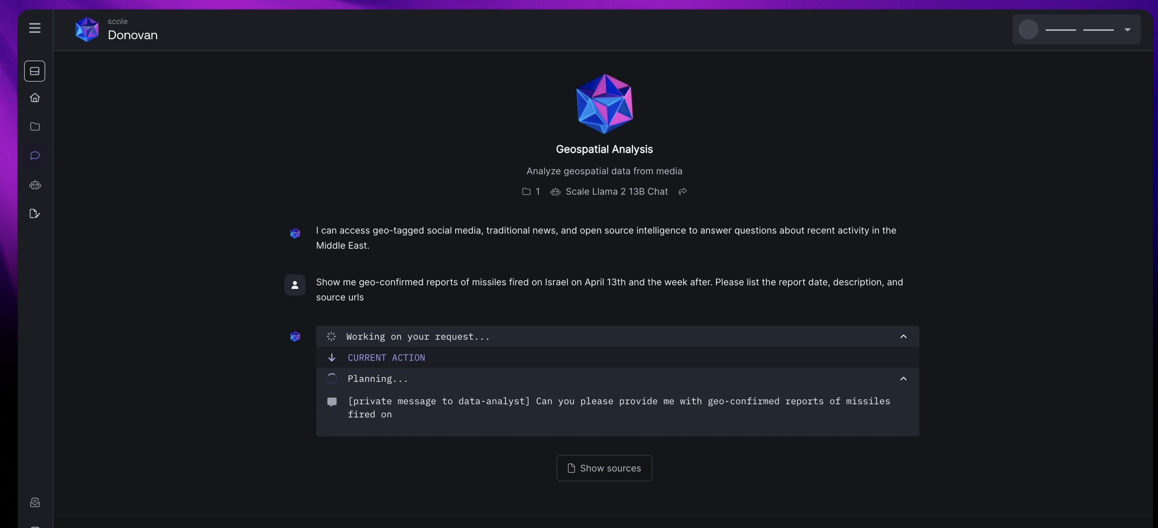 Scale Donovan is an AI suite for the federal government. Donovan ingests data from cloud, hybrid, and on-prem sources, organizes data to make it interactive, and enables operators and analysts to ask questions to sensor feeds and map/model data. Further, Donovan produces a course of action, summary report, and other actionable insights to help operators achieve mission objectives.