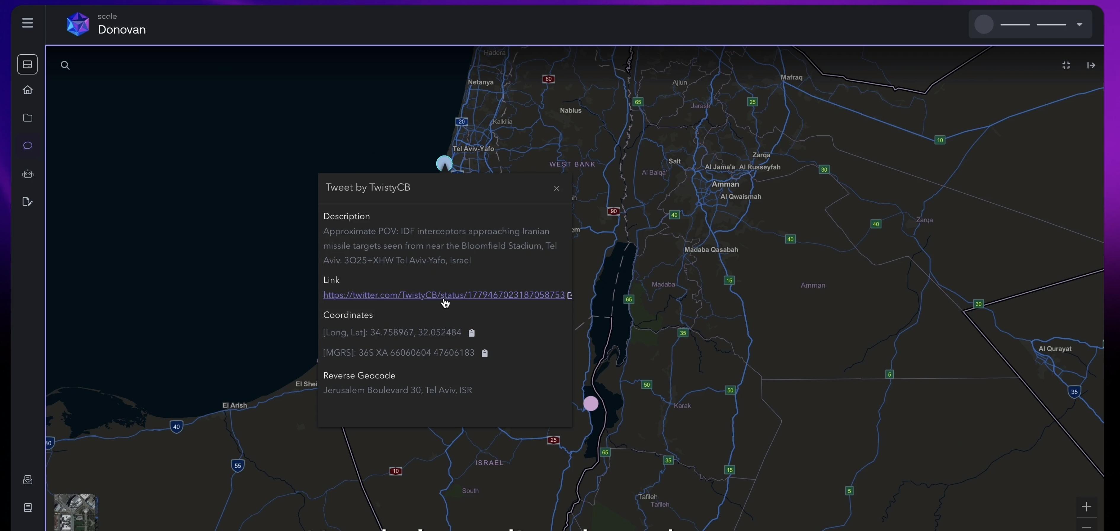 Donovan provides responses relevant to the chosen area and pins locations on the map with enriched metadata from citations, offering detailed and contextual information.