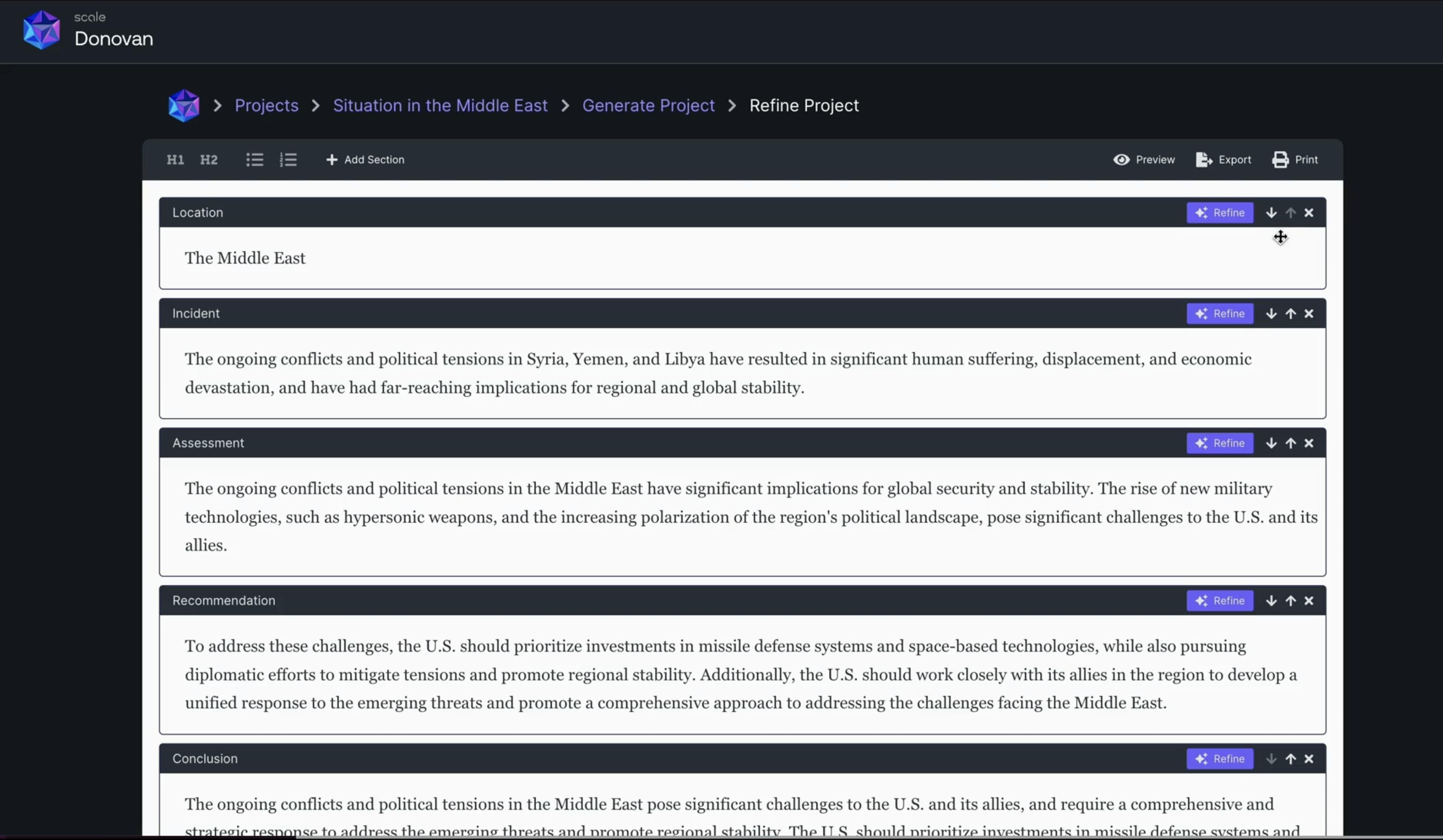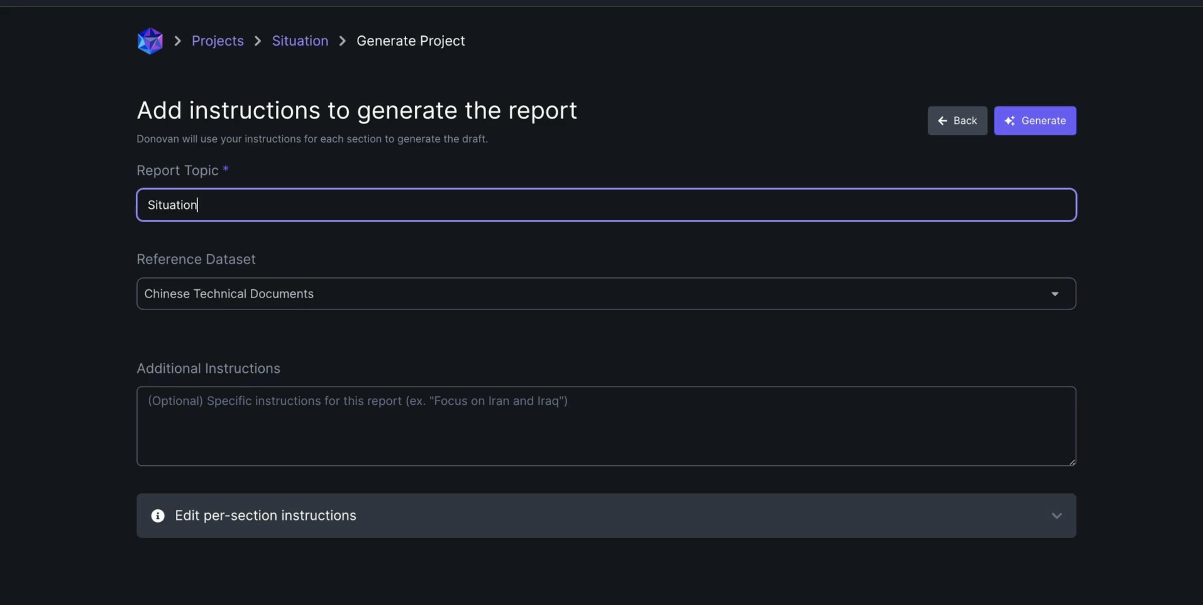 Donovan supports customized report generation through templates designed for common information requests or specific operational documents. Once the report’s general information is added, models that can be chosen will operate and act upon the given information to generate a template report or project that the users can then refine as per their needs.
