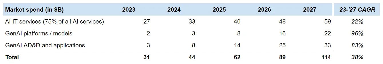 The rise of AI can be attributed to several key factors, including increased computing power in AI chips, a growing volume of training data, improved technological bottlenecks (such as vanishing gradients, which led to the discovery of transformers), and a decrease in cloud storage and compute costs. With its data labeling and annotation products, Scale AI started off by targeting data annotation. The data collection and labeling market is estimated to reach $17.1 billion by 2030 and is projected to grow at a CAGR of 28.9% from 2023 to 2030. Since its early days, Scale AI has evolved into a fuller AI infrastructure service provider, ultimately helping companies build production models over time, representing a $27 billion market, growing at over a 20% CAGR.