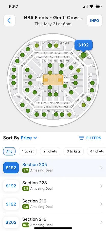 Deal Score helps ticket buyers determine whether a ticket seller’s offer was good value based on factors including historical ticket prices for the performer and the venue, seat location, expected sightline from the seats, and the quality of the other available tickets for the event. Deal scores range from 1 to 10. The closer a deal score is to 10, the better the deal. Deal scores are calculated by comparing each ticket’s expected price to its listed price.