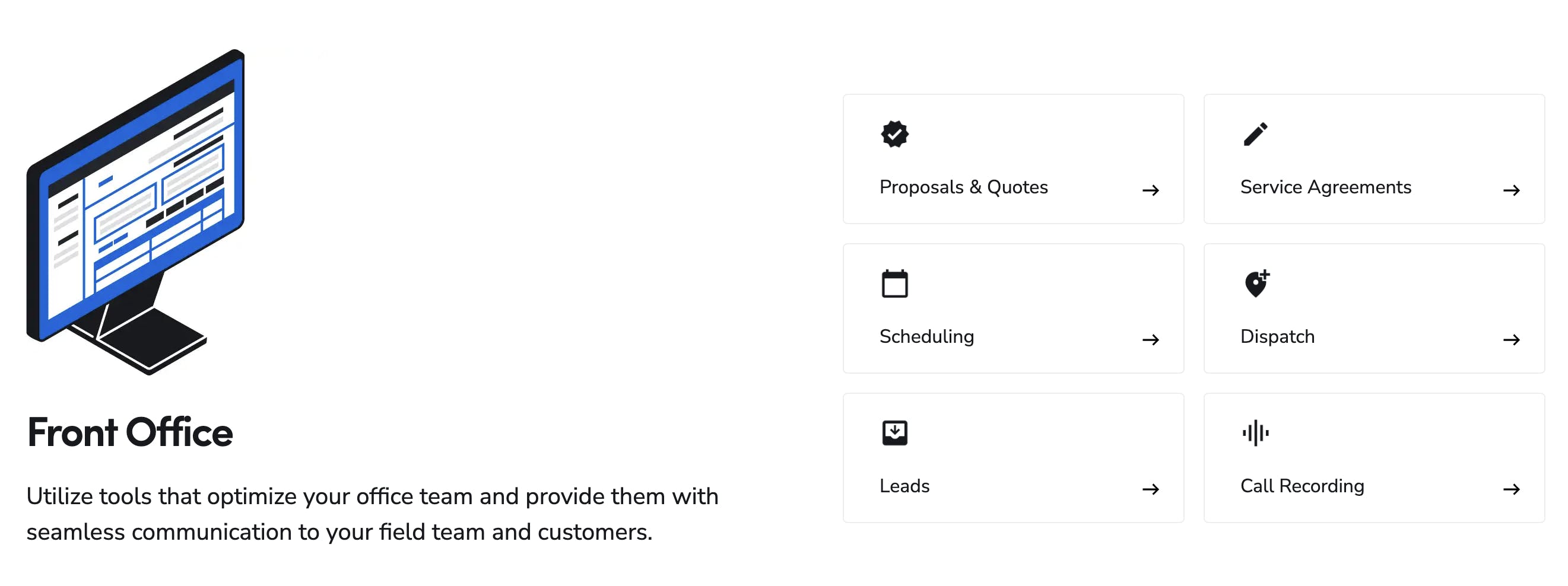 ServiceTitan provides front-office tools intended to optimize an office team and help them more easily communicate with field teams and customers. These include tools to create “branded, professional-looking” proposals and quotes, service agreement tools that automate recurring services, scheduling tools, dispatch tools, lead capture, and lead management tools, and call recording tools to help analyze and improve staff interactions with customers.