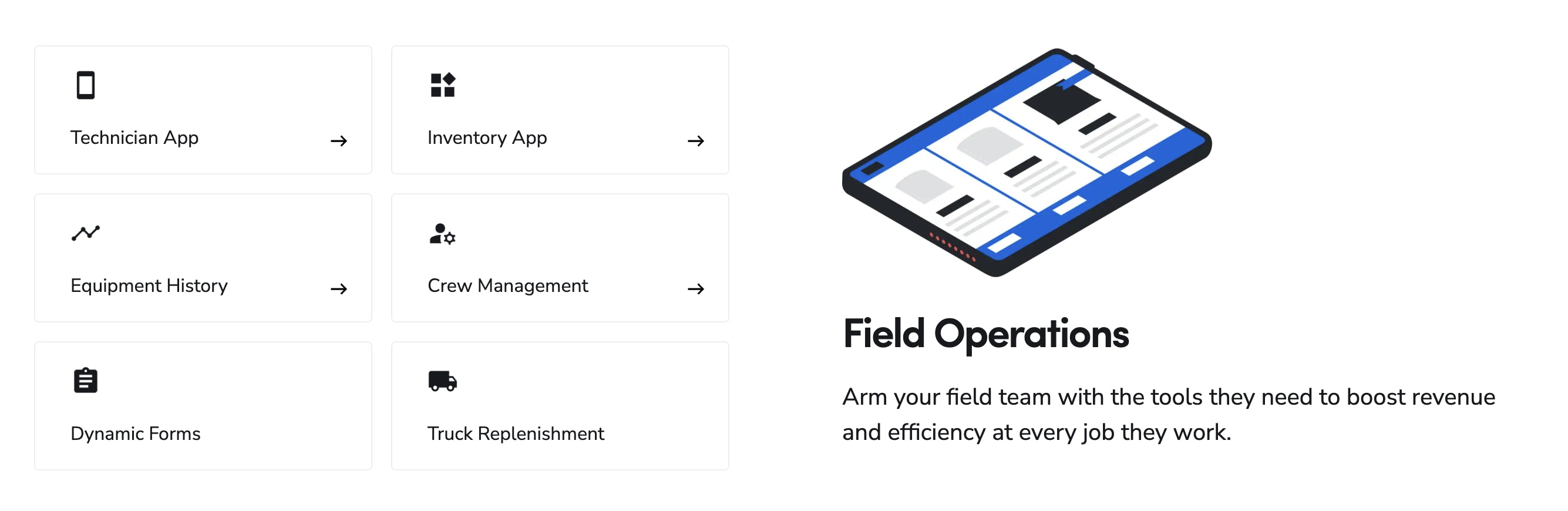 ServiceTitan also provides tools for field teams. These include a technician app that can be used by contractors while on the job, an inventory app for the management of daily tasks and workflows in warehouses, a tool for tracking equipment detail and history, crew management tools, dynamic digital forms for use by contractors in the field, and a tool for restocking truck inventory.