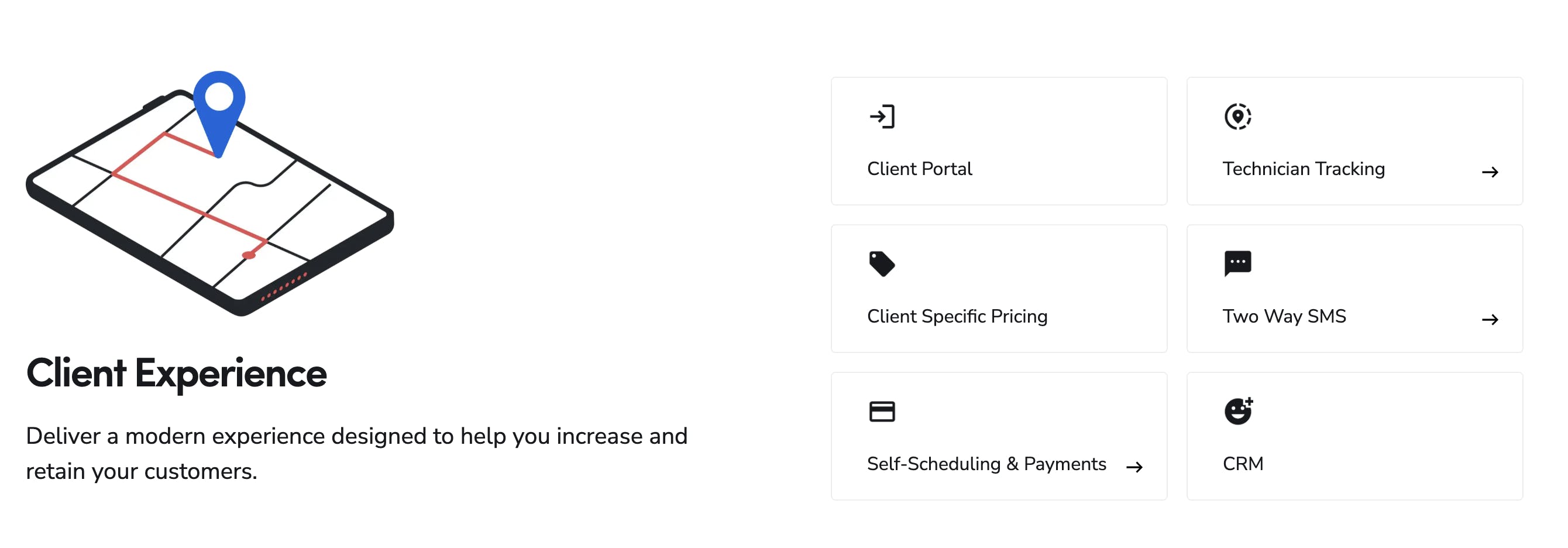 ServiceTitan offers tools to help contractors improve client experiences with a personalized client portal, a technician tracking tool, a pricing tool that dynamically updates downstream variable costs based on pre-built rules, an SMS tool to send and receive notifications to and from customers, a scheduling and payments tool that enables new work requests and simplifies payment processes, and a CRM that tracks equipment, customer insights, and invoices.