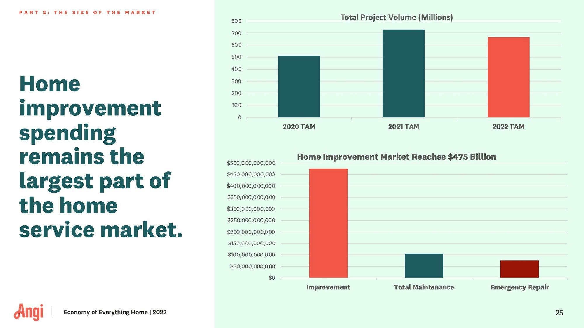 The home service market grew to over $657 billion in size as of 2022, at which time there were ~2.5 million businesses in the space employing over 6 million people, suggesting an average business size of between 2-3 people. In 2023, homeowners spent $13.7K on home services on average (with “home services” encompassing improvement, maintenance, and emergency repairs. Home services spend, which grew rapidly during the COVID-19 pandemic, has continued to grow into the post-pandemic period: in 2023, homeowners spent 51% more on home projects than they did in 2019, while 30% of homeowners in 2023 planned to undertake more work in the following year.