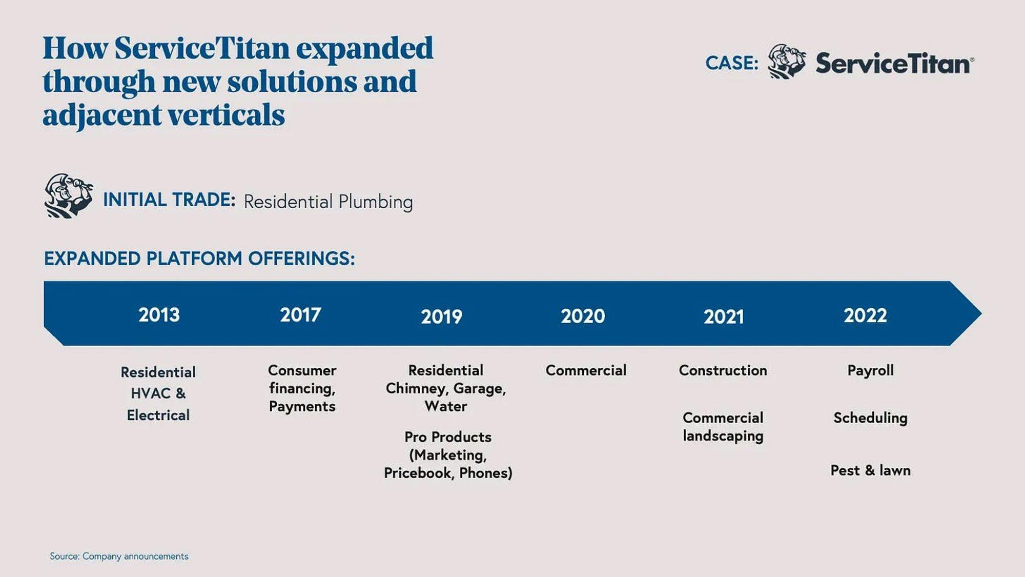 ServiceTitan’s product strategy is similar to many other vertical software companies: it worked to create a dominant position in its category by becoming the system of record for all transactions and customer interactions. Once it established that position, it began to layer on more products to cover more pain points and expand its offering. This approach enables ServiceTitan to upsell its existing user base in the hopes of driving up average revenue per user, net revenue retention, and customer lifetime value.